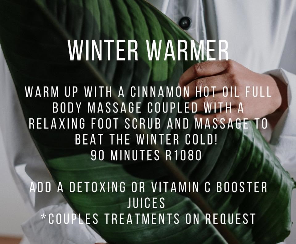 Warm up with a cinnamon hot oil full body massage coupled with a relaxing foot scrub and massage to beat the winter cold!