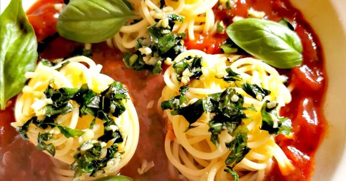 Roasted Italian plum tomatoes and basil with spiralled spaghetti and mozzarella chunks, garnished with basil pesto.