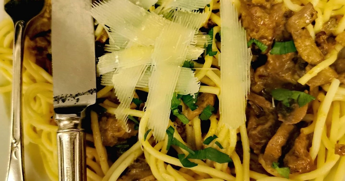 Creamy beef stroganoff with spaghetti and shavings of grana padano.