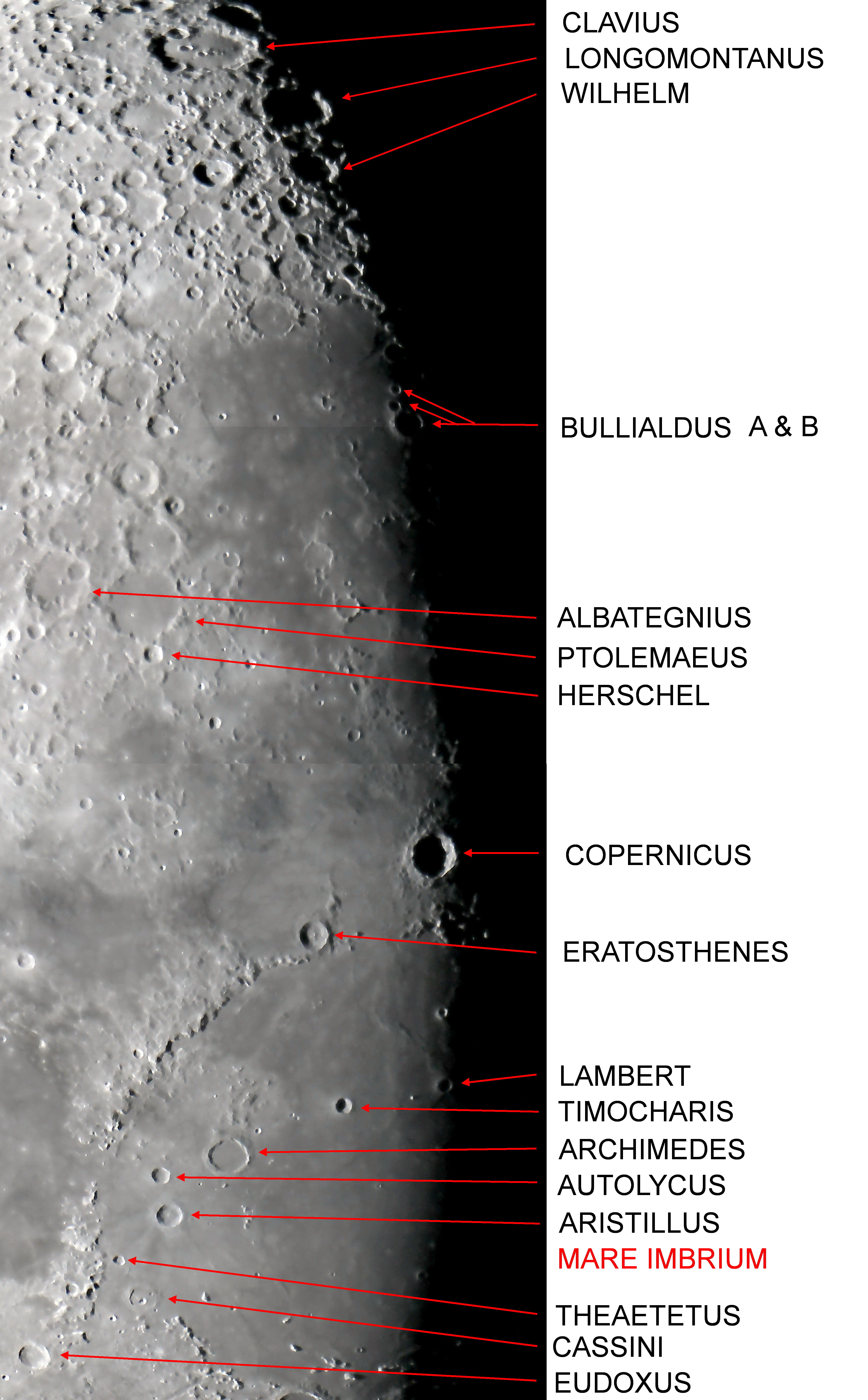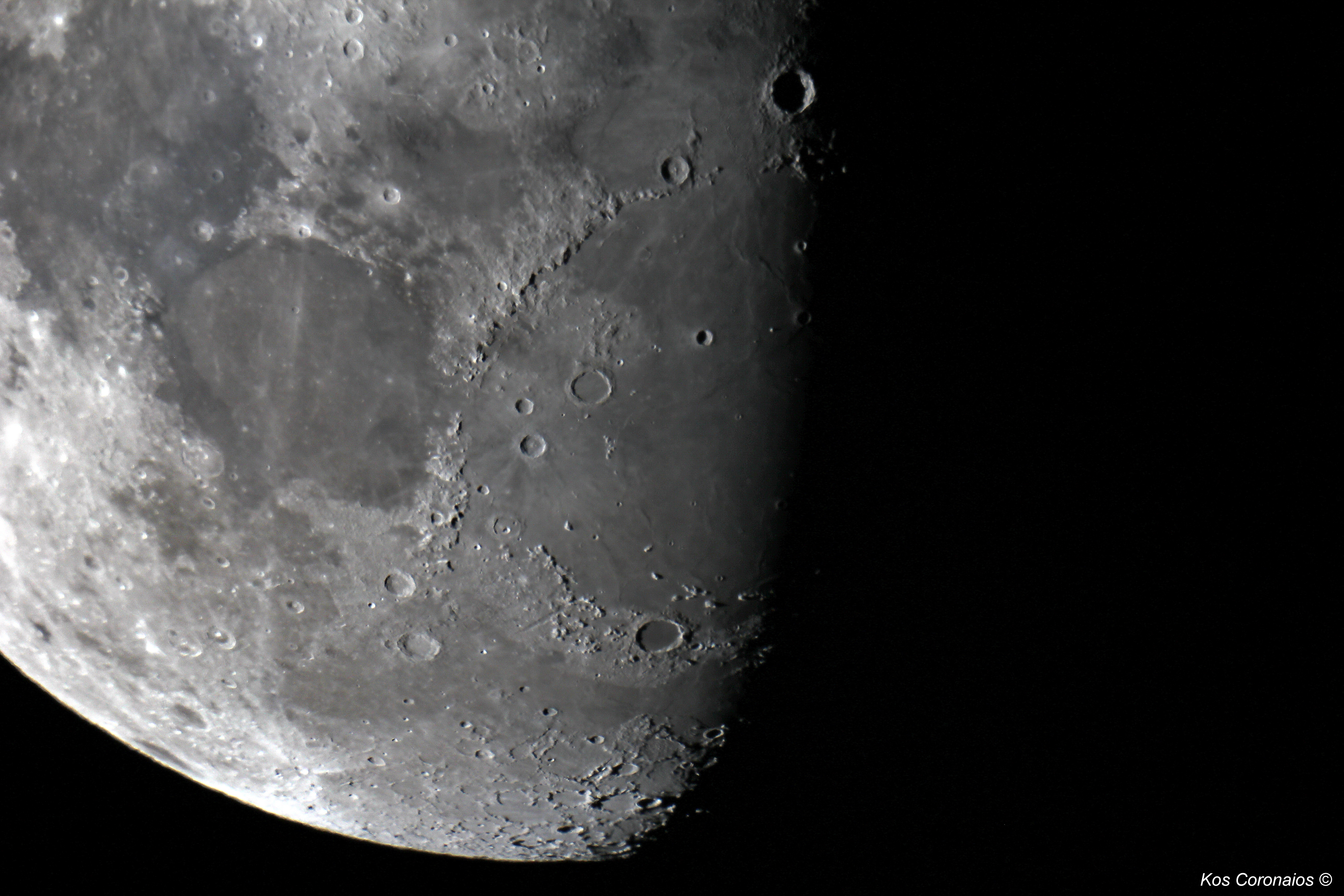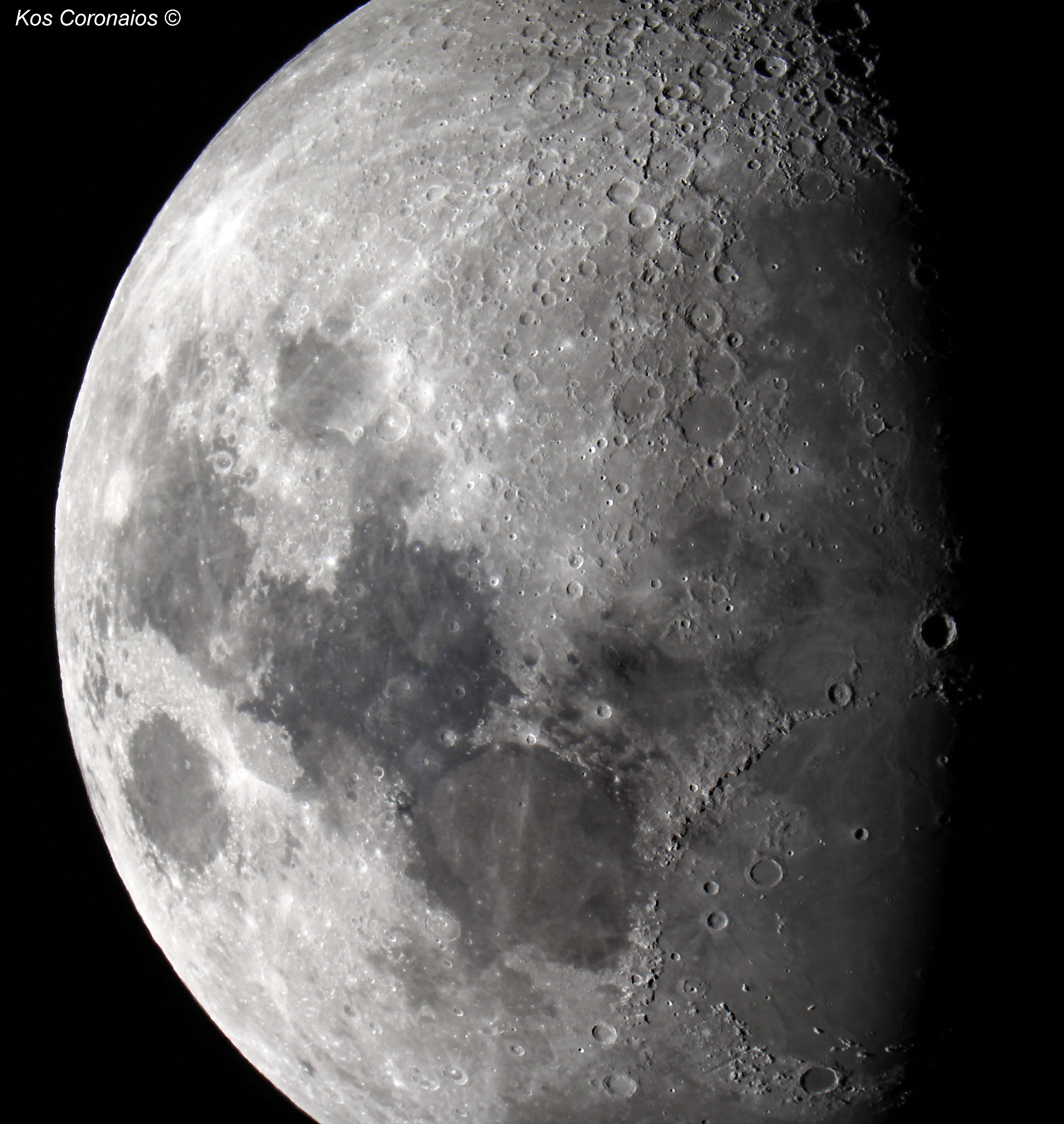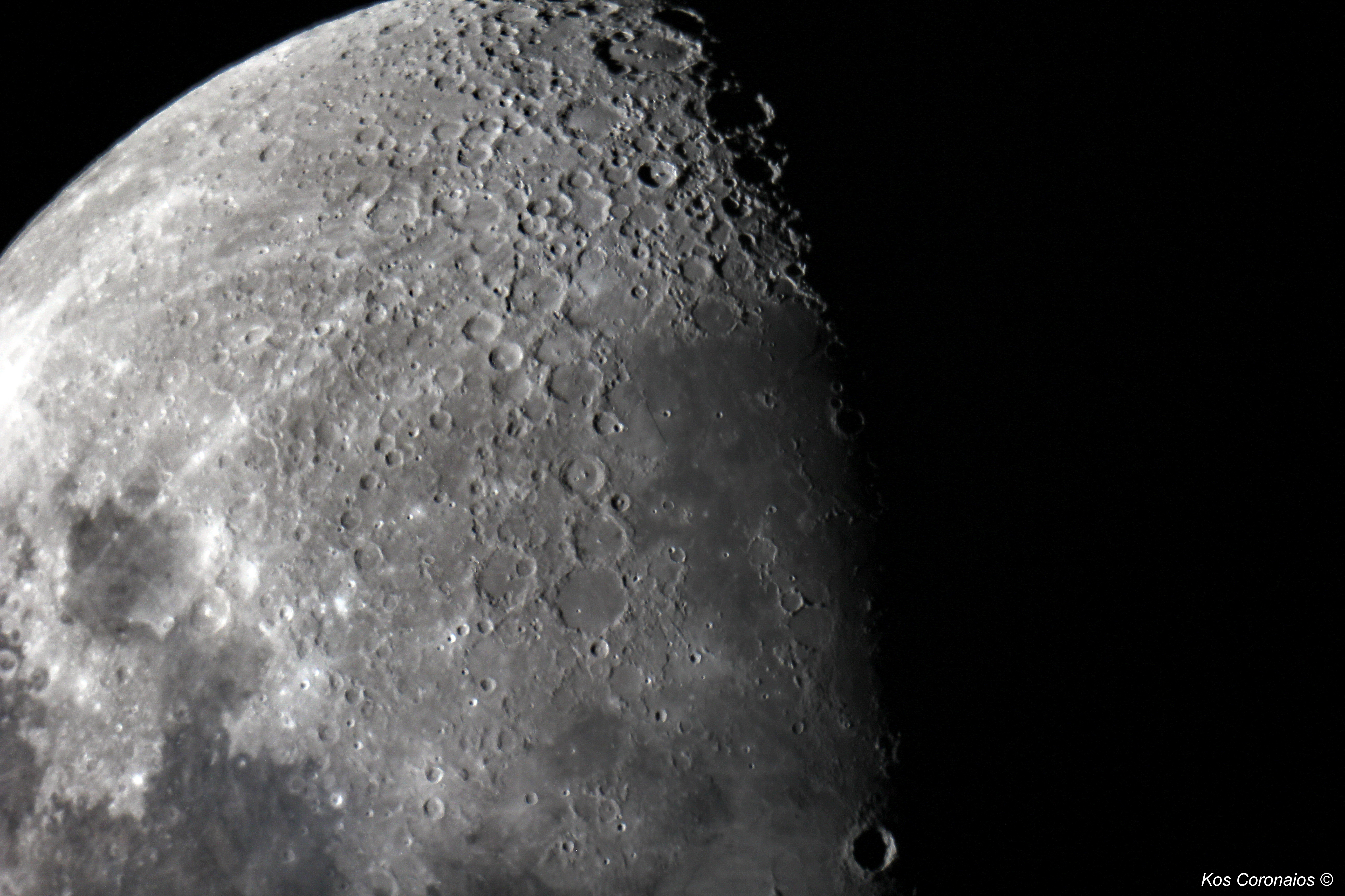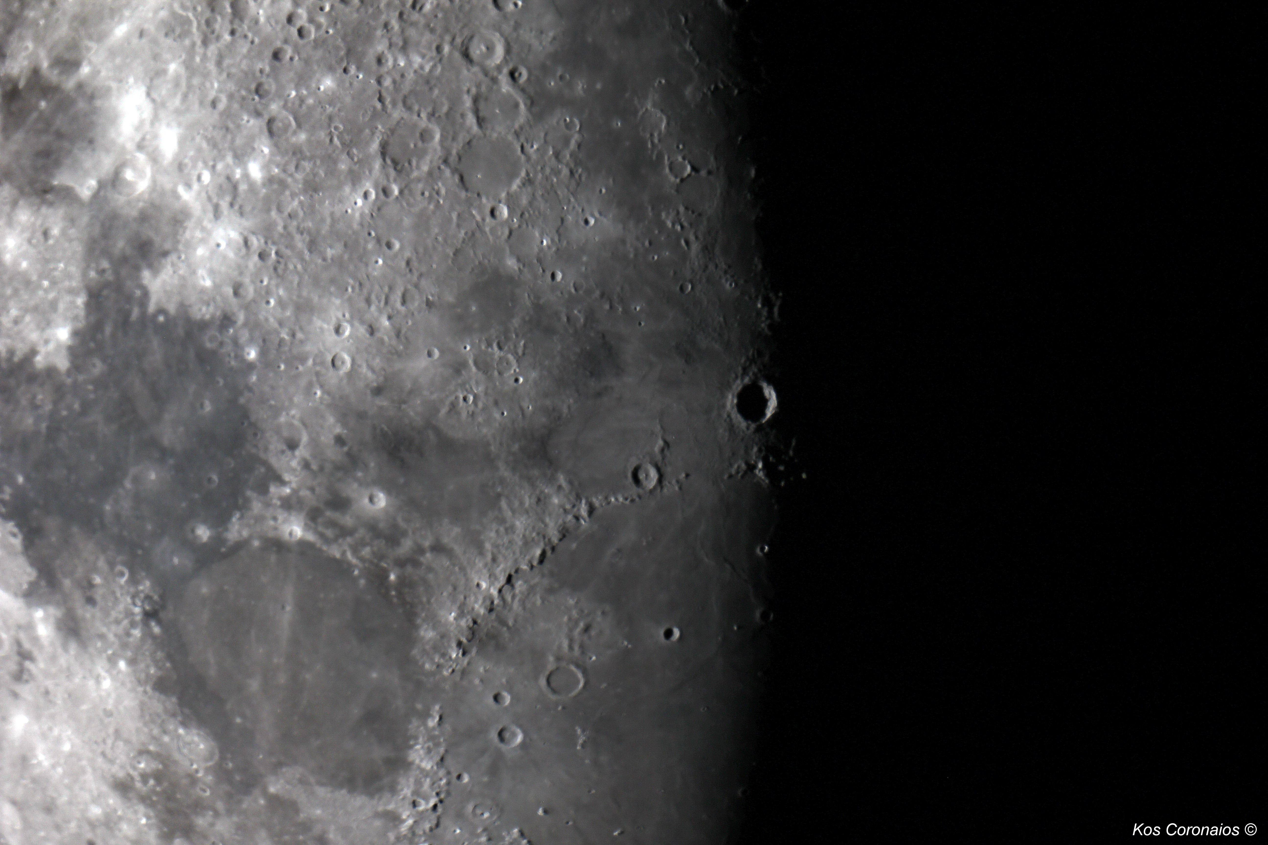 One of the most obvious features of the Moon is that it passes through a number of phases from New Moon to Full Moon and back every 29.53 day (synodic month). It makes a full circle relative to the background stars every 27.32 days (sidereal month), moving its own apparent diameter (half a degree) in slightly over one hour. This motion is easily noticeable when it occults a brigh star or planet. On the 1st as well as on the 28th March, the brightest star in the constellation Leo, alpha Leonis or Regulus is occulted by the Moon. Unfortunately both these events will not be visible from Southern Africa. The line separating sunlight from shadow, is called the terminator, and has nothing to do with Arnold Schwarzenegger and Hollywood. Observing with a telescope this movement can easily be seen by looking at various features on the lunar surface such as mountain peaks and craters. More detail is visible near the terminator as opposed to viewing the lunar surface when it is fully lit during Full Moon when many of the craters are washed out by sunlight, some even disspearing from view entirly.
