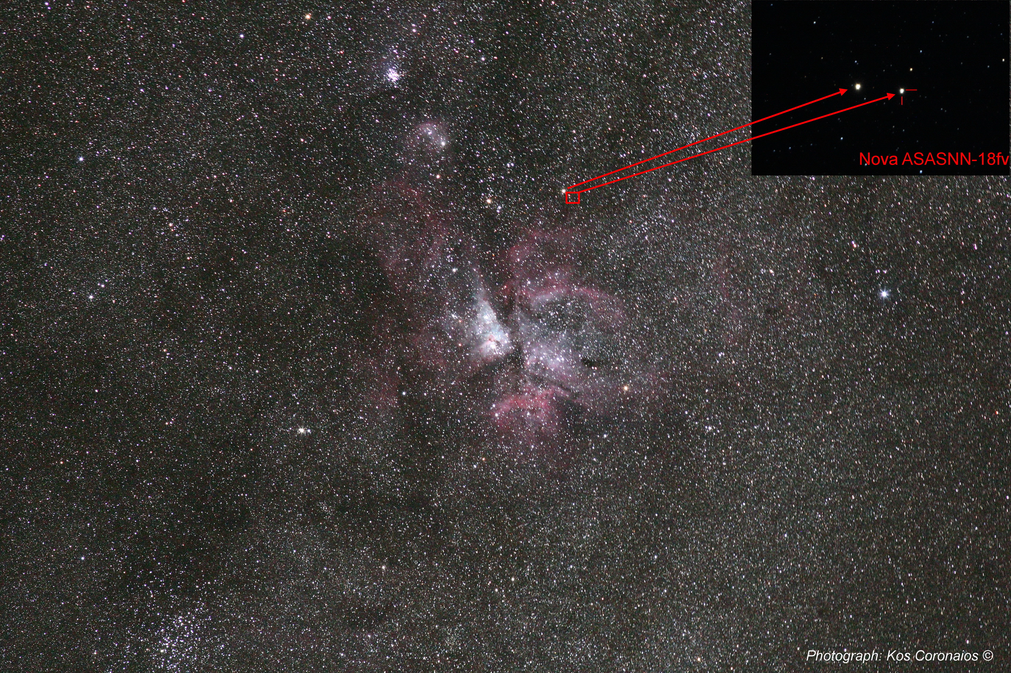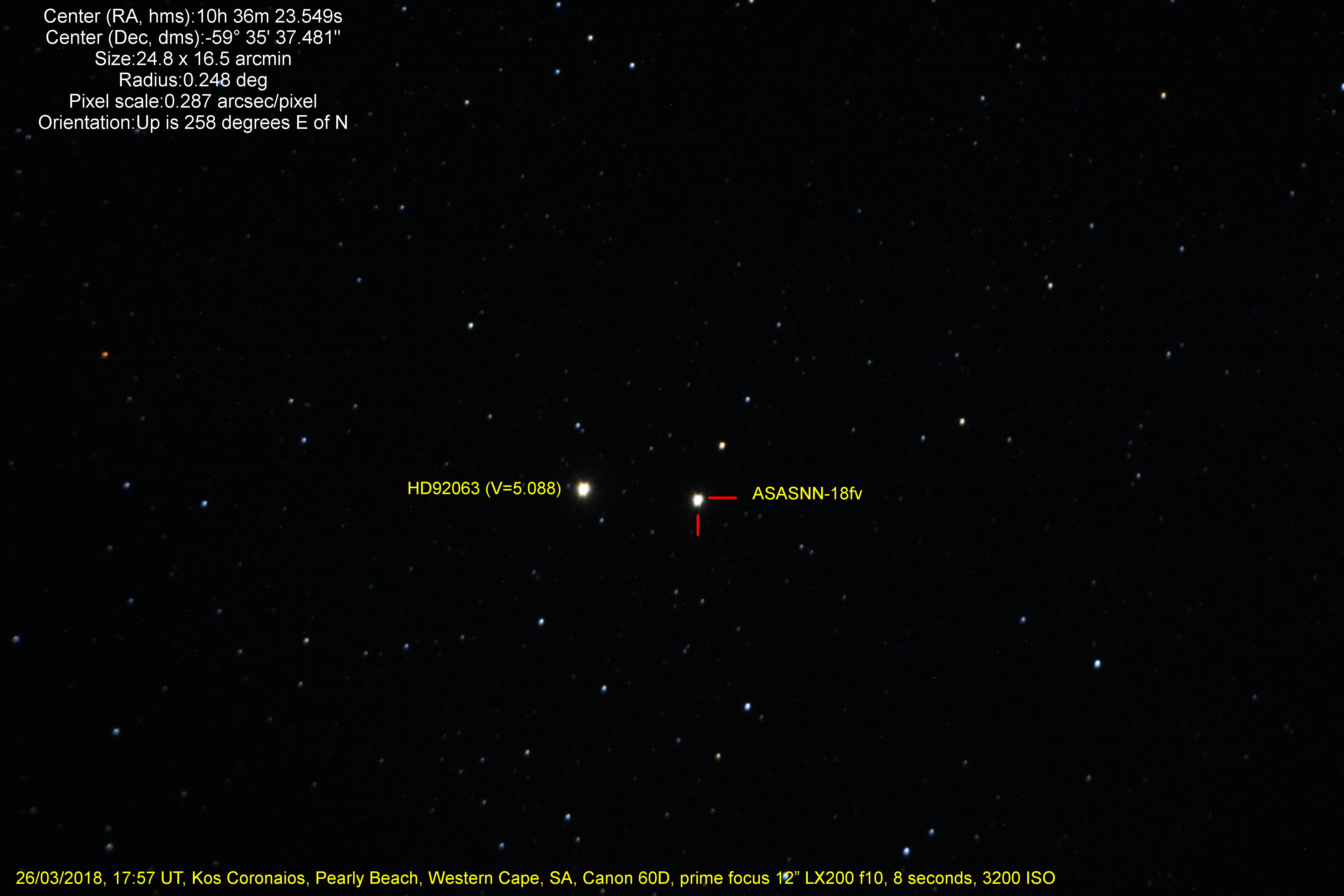Nova ASASNN-18fv is well placed for Southern hemisphere observers, recent reports suggest that the magnitude is between 6 and 7 and just visible to the naked and an easy target for binoculars. The discovery was announced on March 20, 2018 by All Sky Automated Survey for SuperNovae.Pre-discovery images have been matched to a star of Gaia magnitude 20.1.