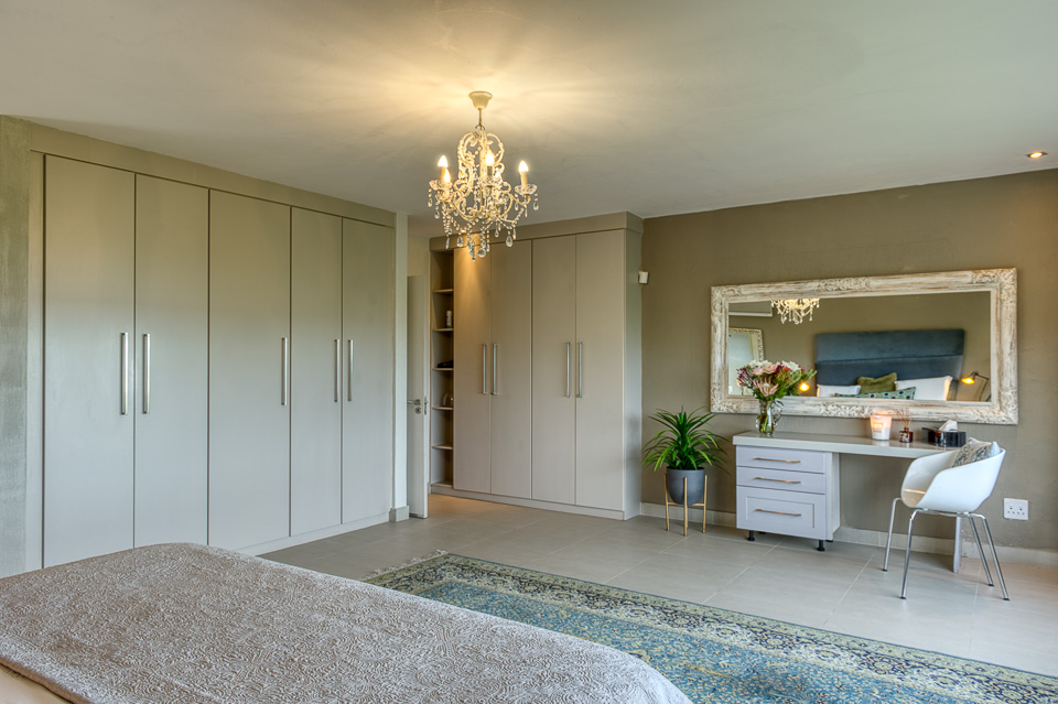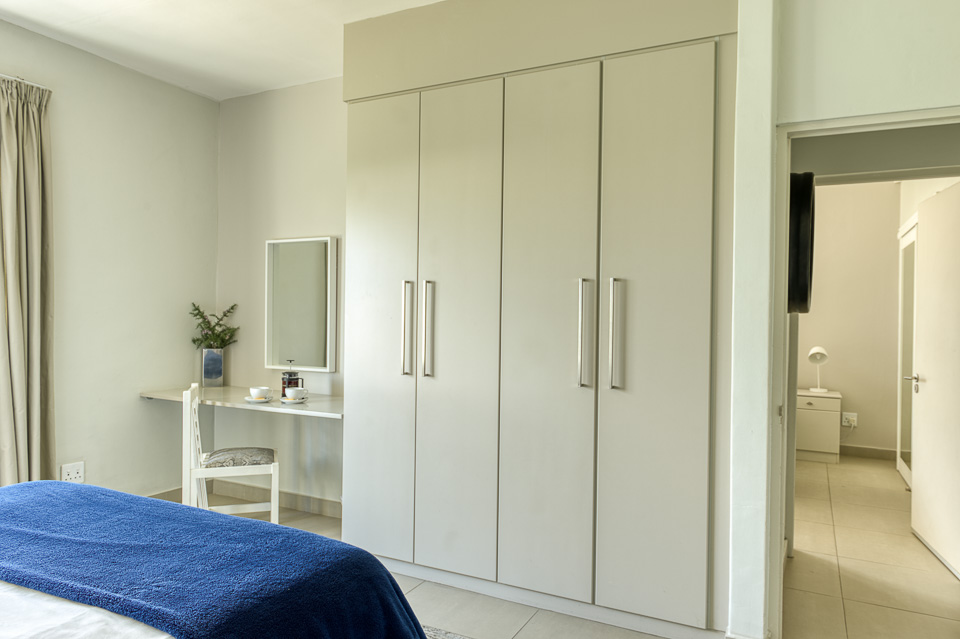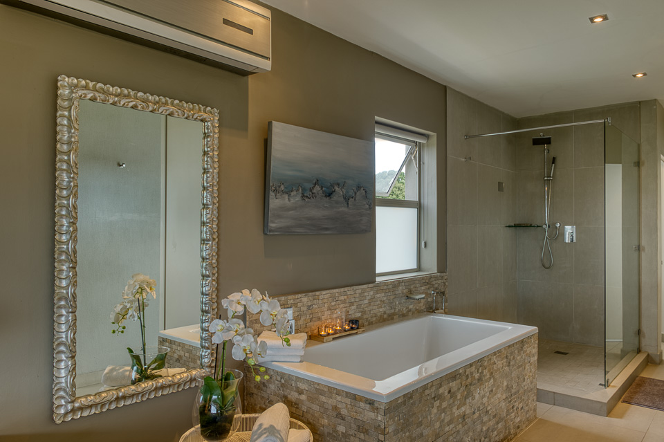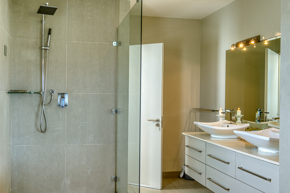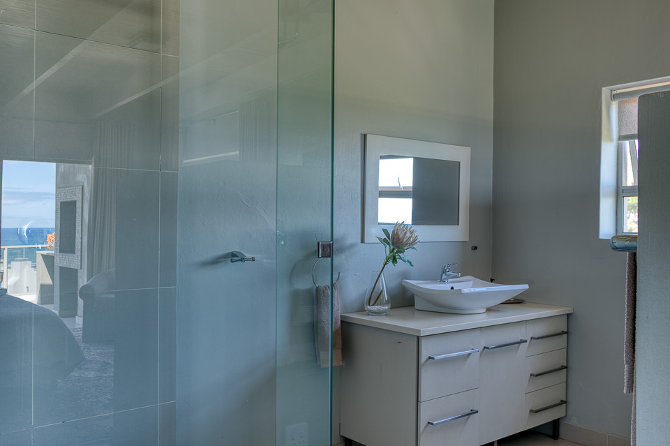 A massive master bedroom with a king size bed and unrivalled views of the Atlantic Ocean. It has a sliding door leading to the patio. The room has an open-plan bath and shower. The basin and toilet are separated by a shoulder-high pony wall.