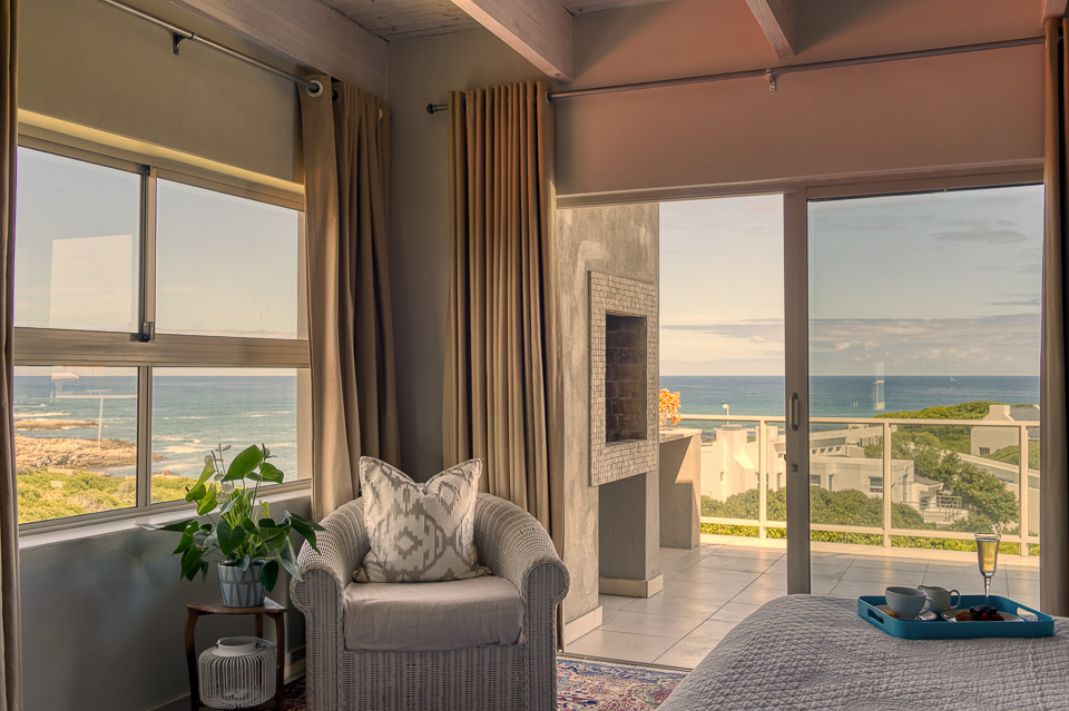 A large bedroom with a queen size bed and magnificent views of the Atlantic Ocean. It has a sliding door leading to the patio. The room has a shower, basin and toilet ensuite.