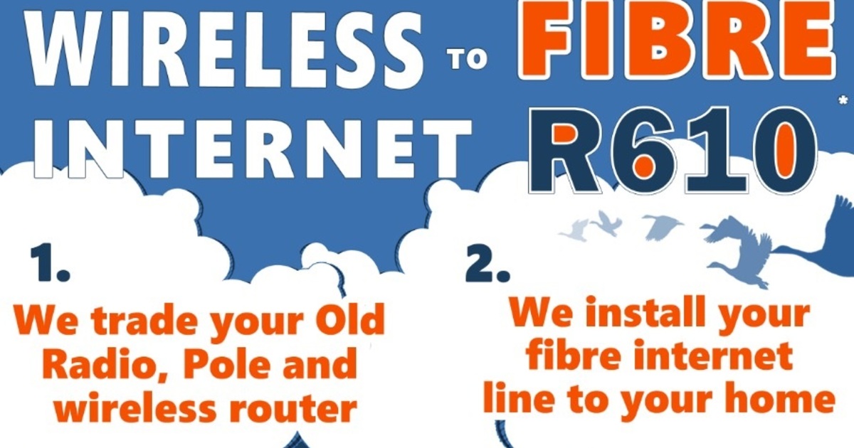 For a once-off fee of only R610, The Computer Hut will replace all your existing wireless equipment with a fibre setup! This is a not to be missed internet deal of a lifetime!