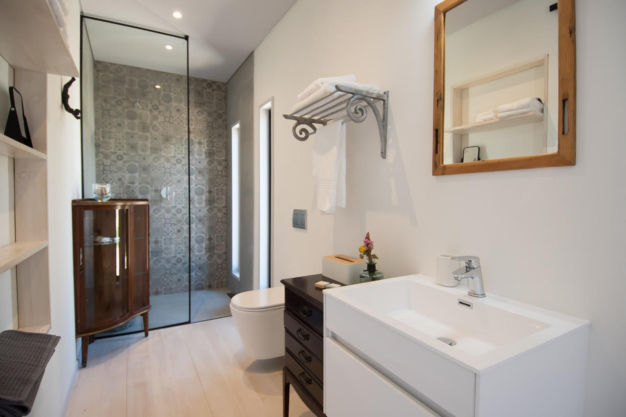 There is a Queen-size sleigh bed and a bathroom with a shower, basin and toilet.