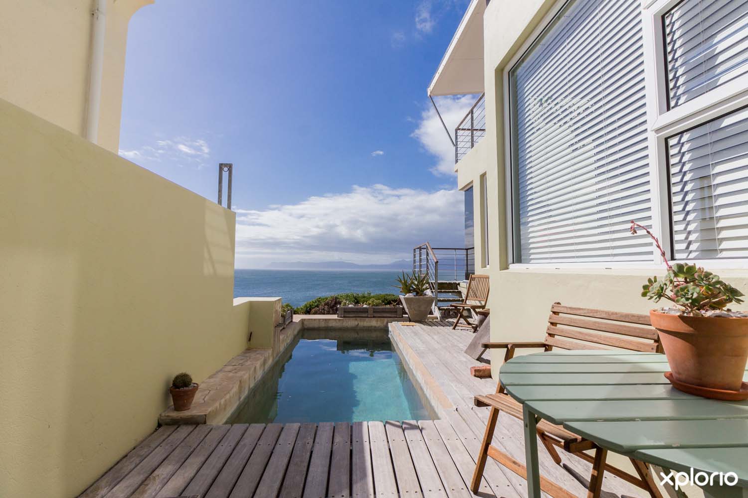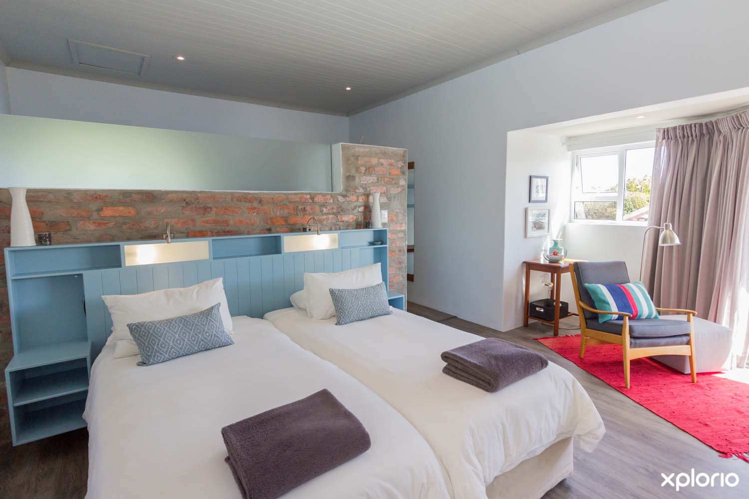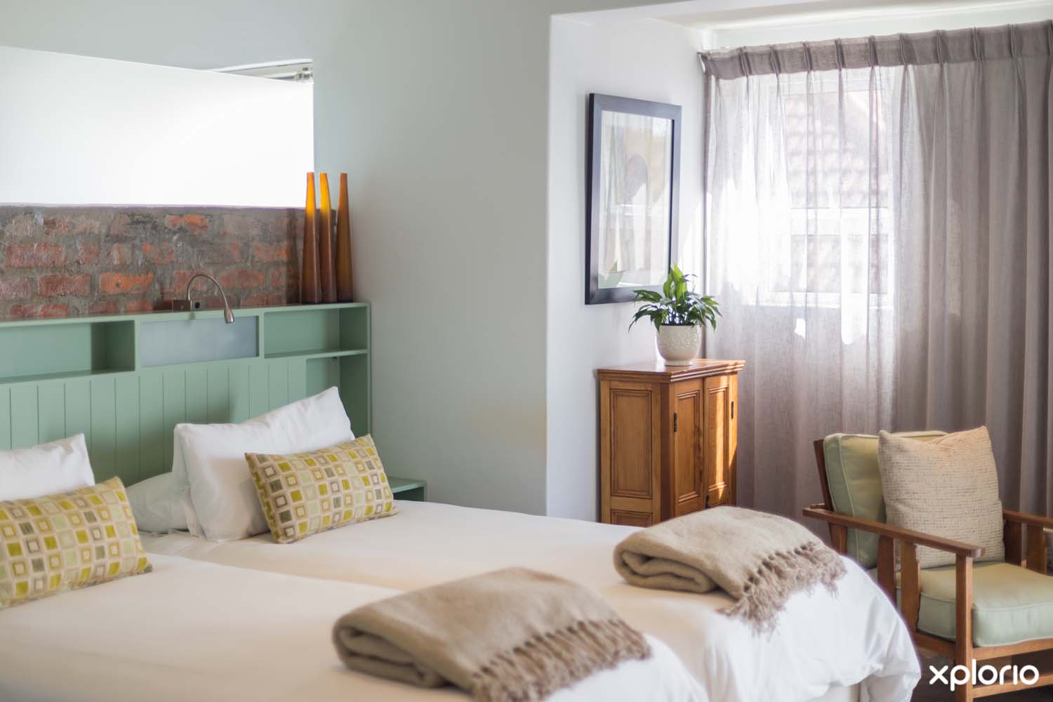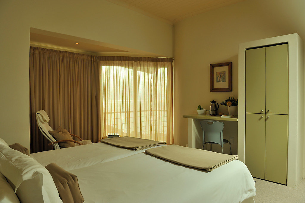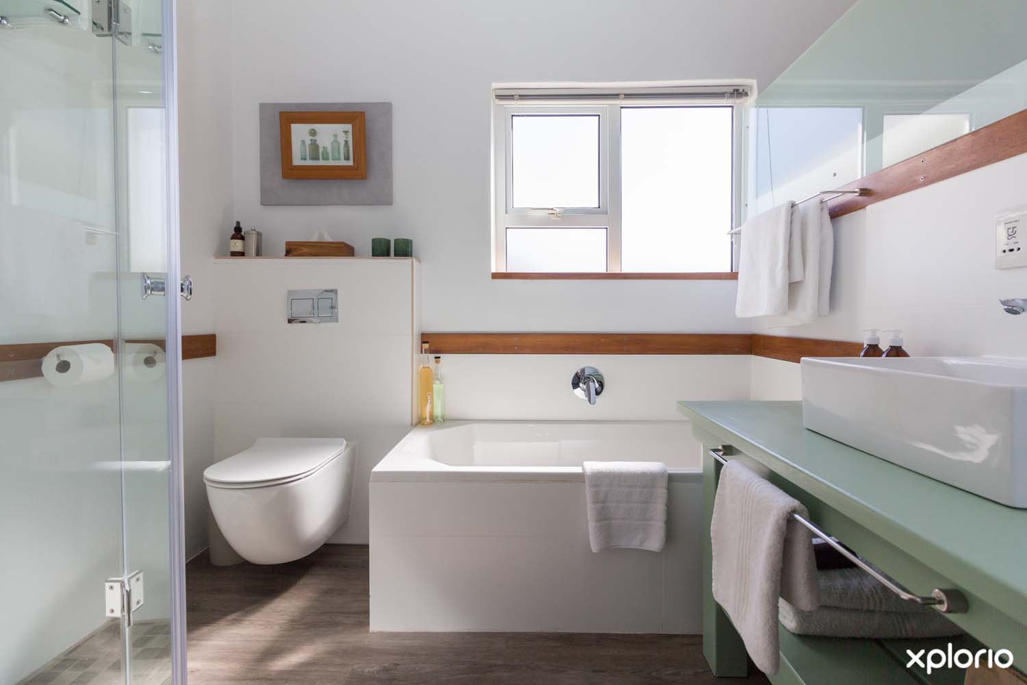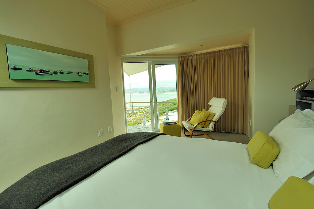 The suite has a 180-degree view over Walker Bay and the surrounding mountains. Watch Southern Right Whales from the comfort of your luxurious king-sized bed or soak in your very own spa-bath as you sip a glass of chilled bubbly. The room has a writing desk and two occasional chairs. The modern, open-plan bathroom is separated from the sleeping area by shoulder-high pony walls.