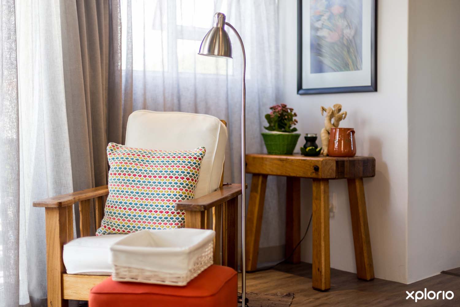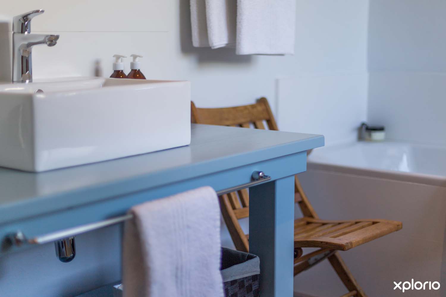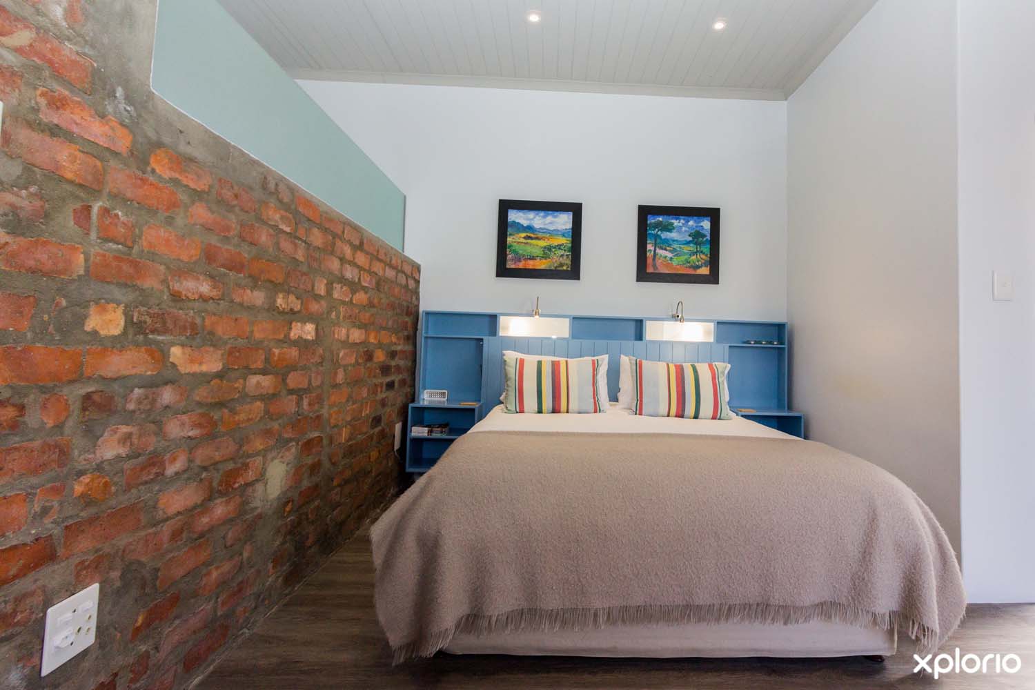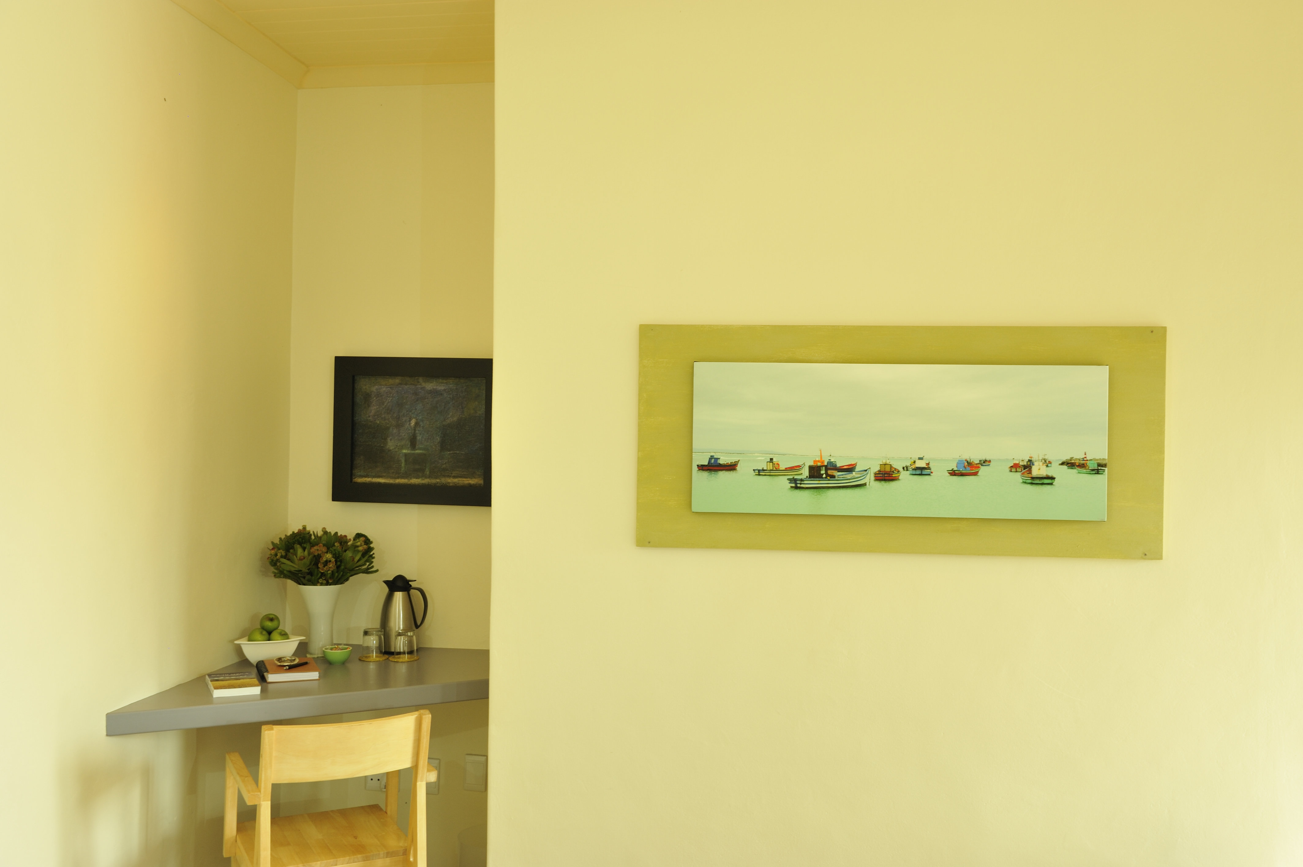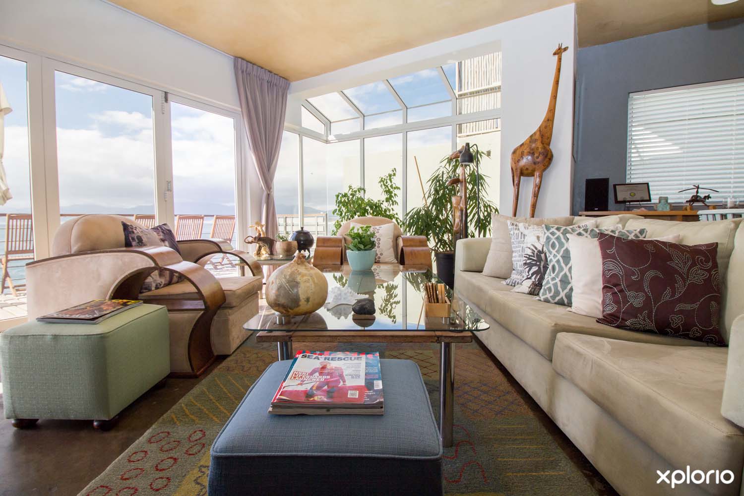 The suite has a 180-degree view over Walker Bay and the surrounding mountains. Watch Southern Right Whales from the comfort of your luxurious king-sized bed or soak in your very own spa-bath as you sip a glass of chilled bubbly. The room has a writing desk and two occasional chairs. The modern, open-plan bathroom is separated from the sleeping area by shoulder-high pony walls.