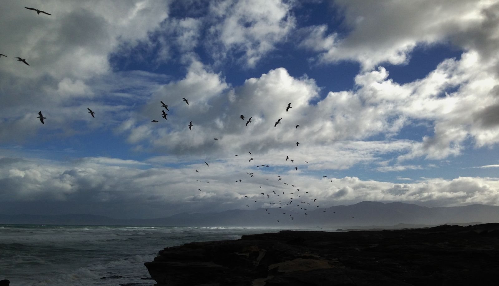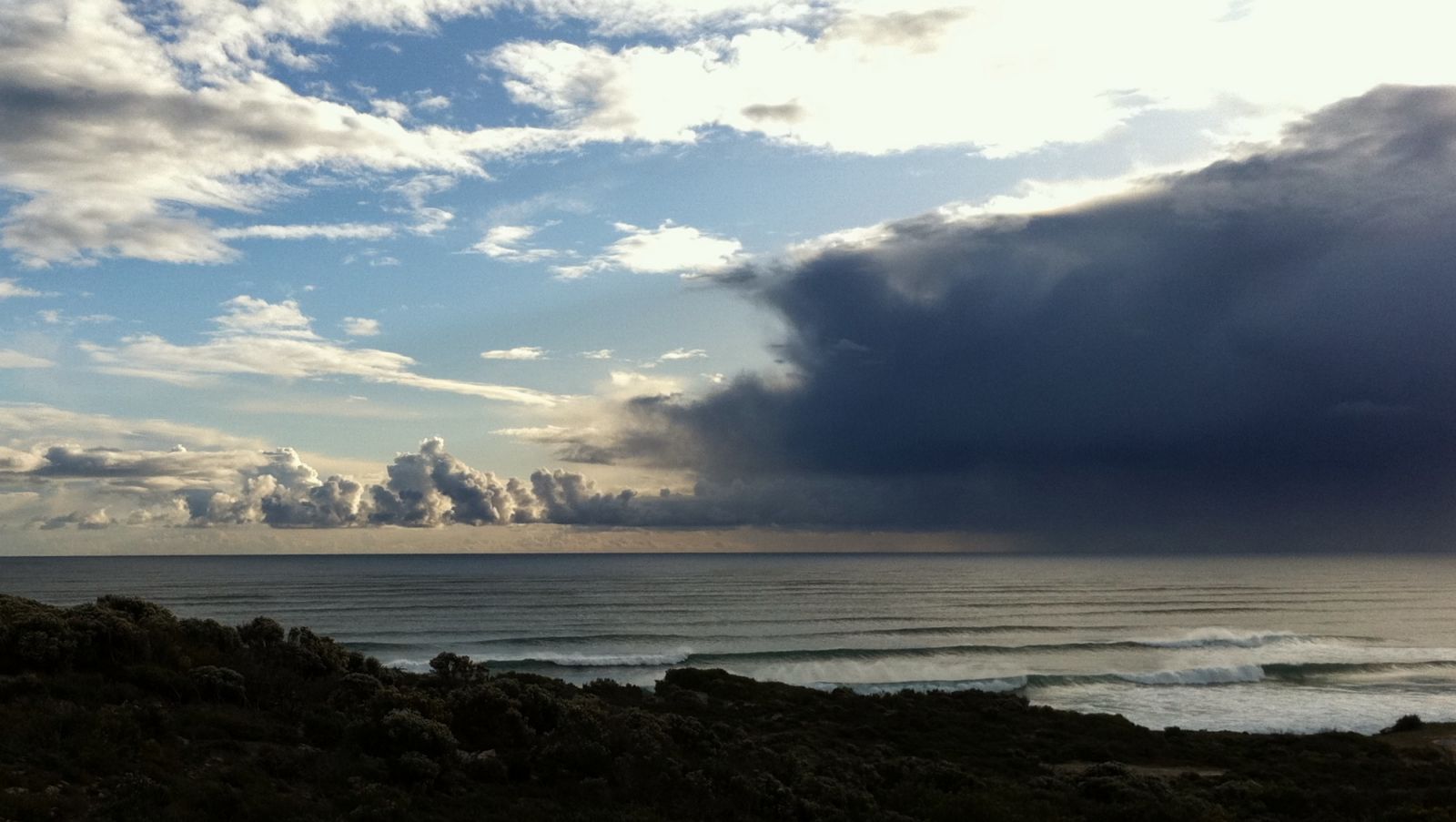 he first drops of rain begin to fall, caressing my skin. I turn to face the rumbling sea, beholding an oceanic beckoning to the clouds billowing over the water. The sun is casting his dusky rays, a sight of golden penetration through the clouded embrace. The clouds are wading in thick now as they begin licking every morsel of blue sky until the grey bulge promises a hefty belch. I turn and head for the warmth