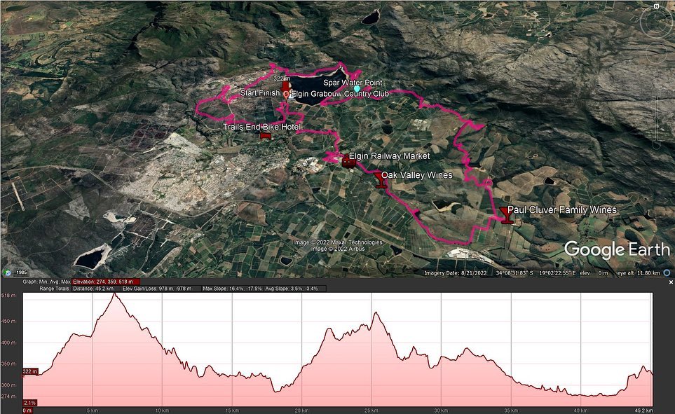 Final routes and rlevation profiles for the Bikes2Blossoms WC XCM Championship event on October 1, held at Elgin Grabouw Country Club.