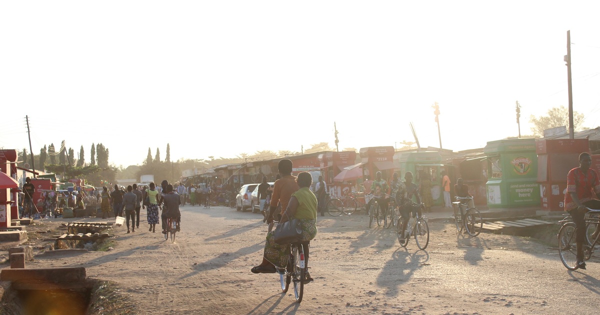 A woman catches a bicycle taxi through town, Malawi. Bianca Silberbauer
