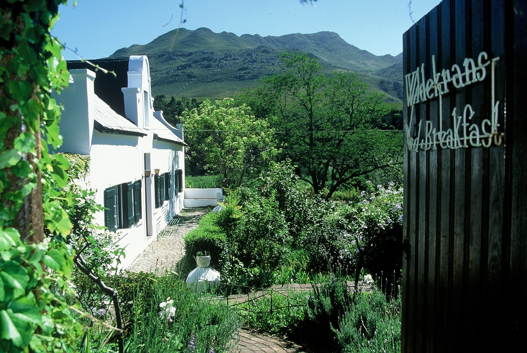 Wildekrans Country House is a historic 1811 homestead situated in the village of Houw Hoek in the Western Cape. Overlooking a rambling garden that cascades to the river, and silhouetted by a rugged mountain backdrop, the house is furnished with antiques and contemporary South African art.