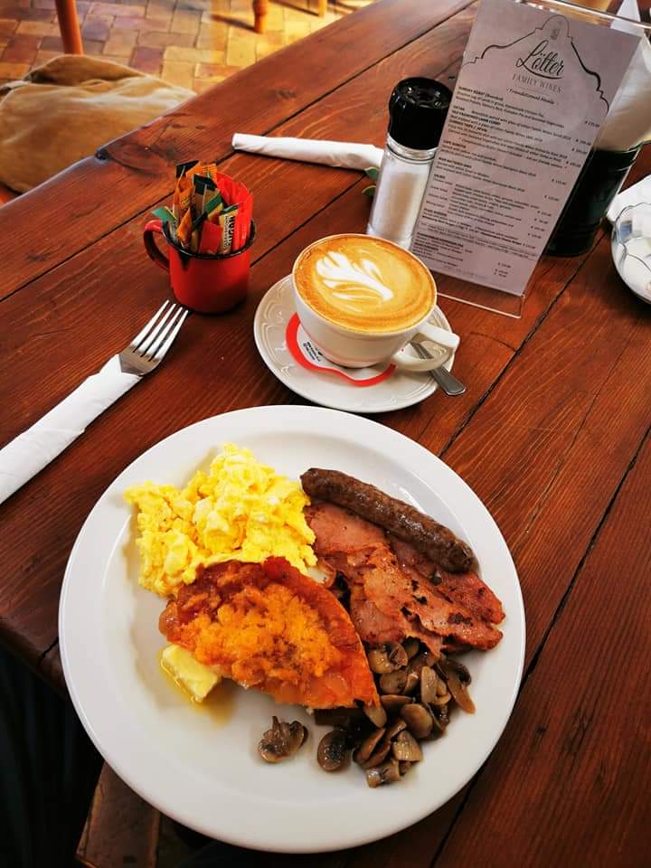 Farm Eggs (Free-Range), Beef Sausage, Bacon, Pan-Fried Mushrooms, Corn Porridge with Tomato and Onion Puree, Farm Bread Fresh or Toasted / Plaaseiers (Free-Range), Beeswors, Spek, Pangebraaide Sampioene, Mieliepap met Tamatie en Uiesmoor, Plaasbrood Vars of Gerooster