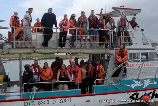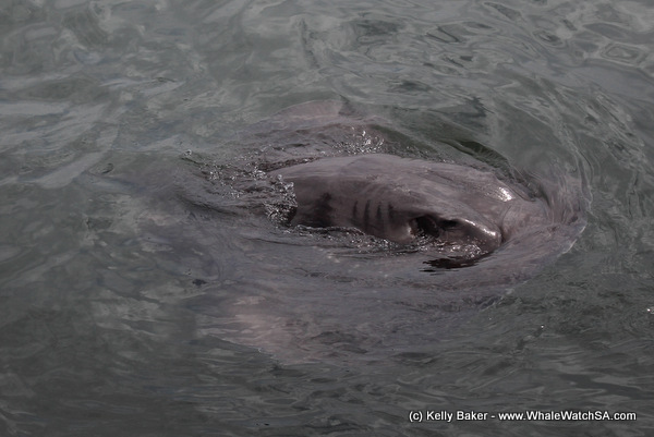 The sharks appeared as the mist started to disappear with our first shark one of the largest sharks we are seeing in the area at the moment, a male close to the size of the cage, that is to say approximately 4.3m in length. This male made a surprise attempt at our seal decoy and then unfortunately did not visit us again. Not long after though a smaller male showed up, one we have been seeing infrequently around the boat over the last few weeks with some distinct white marks on the left side towards his caudal fin. This small male was joined by another similar in size with a hook seen in the left side of the jaw. There is no trace of the line still attached and we hope that this hook will soon rust out. These sharks disappeared shortly after the next shark arrived, a large male just under 4.0m in length, this was “Sellendilloh” the current satellite tagged white shark in the bay. He was tagged in April 2012 in Gansbaai by American based research group Ocearch, who make the data accessable to the public on their tracking website. The last shark to arrive was yet again a large male, just on 4.0m in length, it appears the males are dominating the bay right now, something possibly to do with the La Nina weather patterns presently seen, as the presence of male sharks can be found to increase with cooler water temperatures. We also had a Short-tailed stingray gliding around the boat for the last cage, a nice chance for our guests to see another of our bays inhabitants.