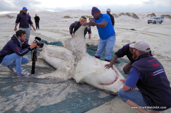 Its 12pm and a third deceased white shark has washed ashore, this time in Struisbaai. The NSRI site manager notified Dr Alison Kock and the white shark research group. It was decided that the Dyer Island Conservation Trust team were the closest to the site and so they dispached their team once again to go and retrieve the shark carcass using two 4x4 vehicles and a small vessel trailor. "We have never seen anything like this.Todays carcass is another large white shark, he is a 4.2m male and his injuries seem to match those of the previous two dead specimens" says Alison Towner white shark biologist at the Dyer Island Conservation Trust. "It seems likely that orcas are again the cause of death but we will confirm after the autopsy. Obviously this is a very sad time for us all, nature can be so cruel and the dexterity these enormous animals are capable of is mind blowing, almost surgical precision as they remove the squalene rich liver of the white sharks and dump their carcass"