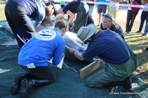 The team collected samples are required by members of the white shark research group in South Africa and Department of Environmental Affairs for a multitude of research projects. The necropsy began with extensive morphometric measurements to obtain accurate size information. Parasites such as copepods and nematodes are extracted and preserved, muscle tissue is preserved for genetics diet and physiology studies and all the wounds measured and examined closely. Vertebrae is collected for age growth studies and all organs are inspected weighed and measured.