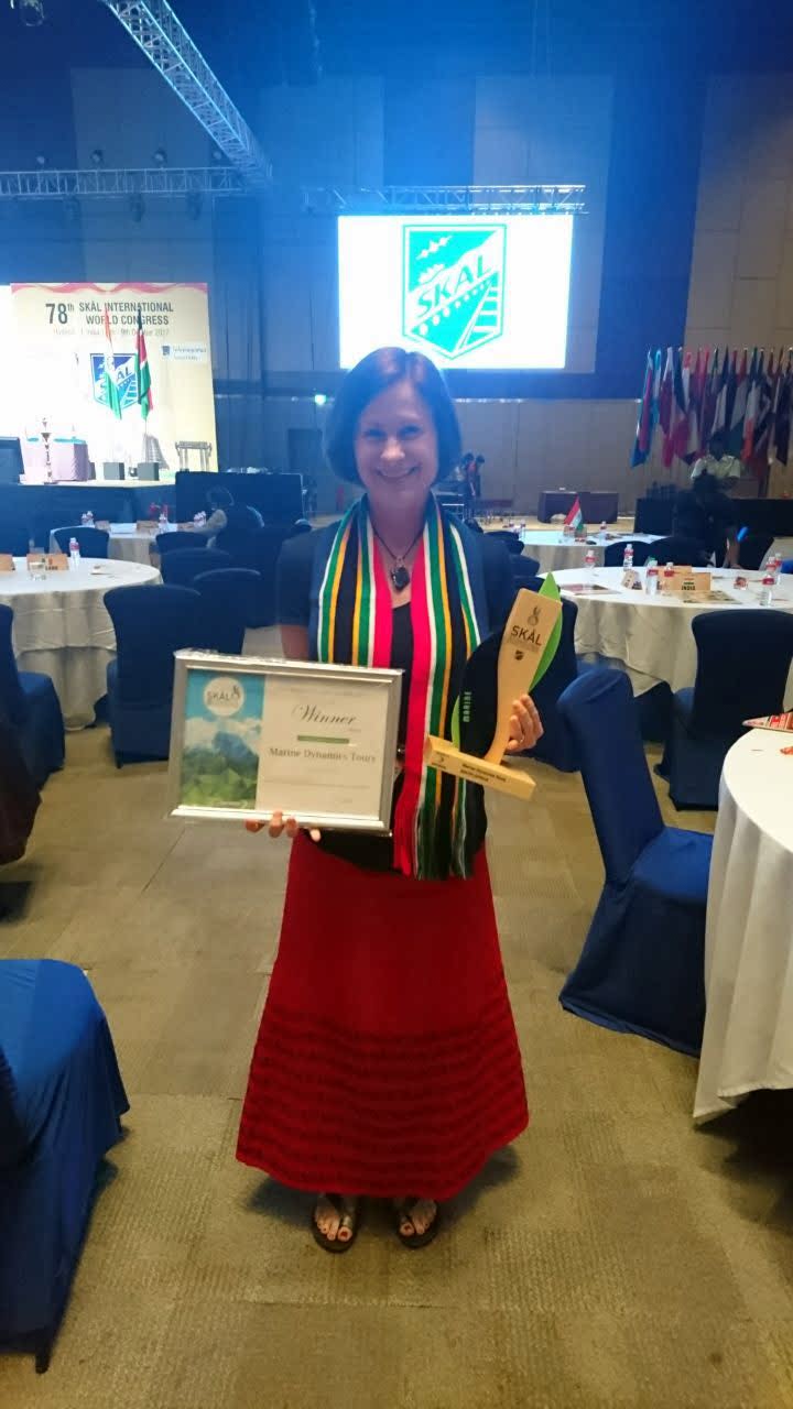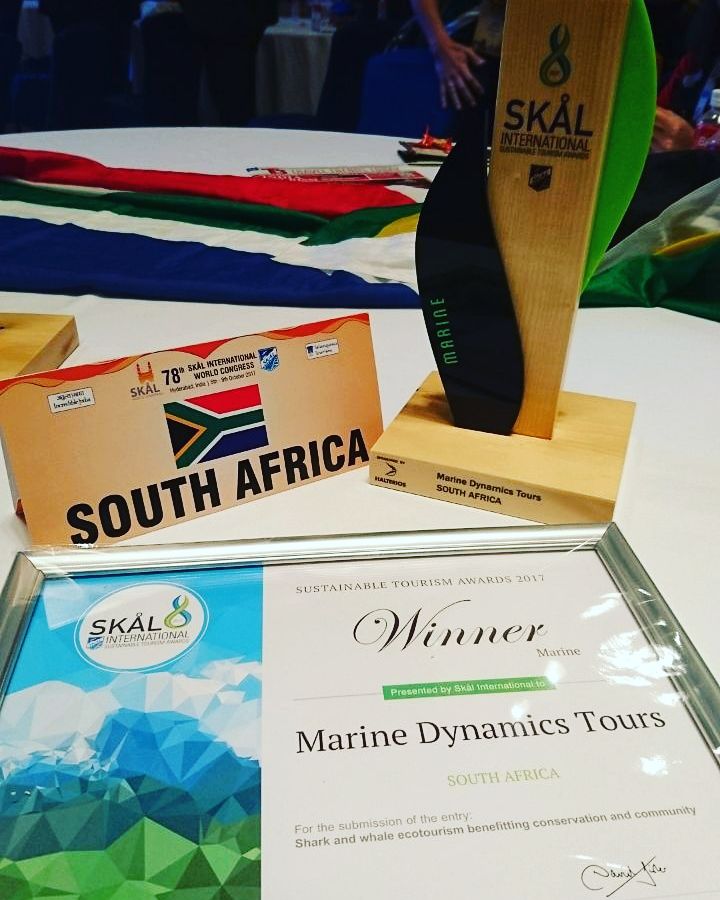 Marine Dynamics wins award for Shark and Whale Eco - Tourism Benefiting Conservation and Community at the Skål World Congress, Sustainable Tourism Awards 2017, in Hyderabad India.