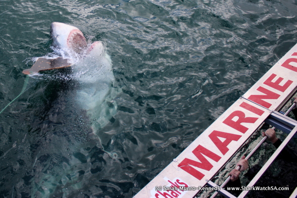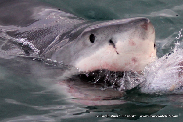 This trip didn’t have to wait too long before a white shark appeared. It was the juvenile female white shark from our first trip, and she was a bit shy, staying a few meters from the boat, never coming into very close. Fortunately a short while later we had a larger 2.8 meter white shark cruise up to the cage, making some beautiful passes that everyone was able to see. This shark spent a little bit of time with us, before disappearing. We were hopeful that one of the first sharks would return, but they didn’t, and we soon discovered why. A stunning 4.5 meter white shark cruised up to the boat, slowly passing the cage and began to investigate the seal decoy. We were so lucky to see such a large animal that nearly dwarfed our 5 meter long cage! This shark had been through some adventures as it was missing the tip of the top of its tail and was covered in various scars. It’s massive size had everyone awestruck and we were thrilled we could end the trip with such a stunning white shark. The third and final trip of the day practiced great patience with a 30 minute wait for our first shark to appear, this animal kept deep, not breaking the surface of the water but giving some nice passes before disappearing. The second and third sightings for the trip took the form of larger females, the 4.0m plus female with a hook in the left side of her jaw and the 3.4m female covered from head to tail in darkly pigmented scars. These two were the more active sightings of the afternoon, breaking the surface with quick attempts at the bait or decoy line. To finish of the day we were visited by one of our little juveniles, small and shy it kept it's distance.