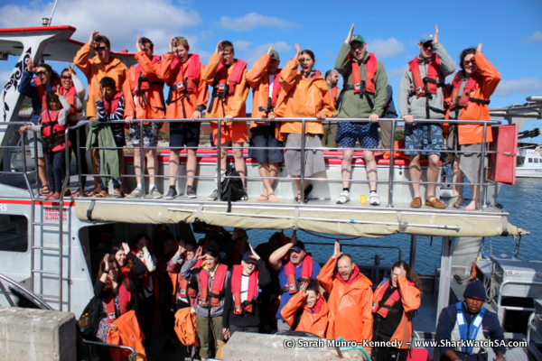 The day began with the sun rising behind the mountains, giving us a beautiful sunrise as we ventured out to sea. We were hopeful for what the day would bring us after having consistent white shark sightings for several weeks. We were lucky to be visited by a bronze whaler shark within minutes of anchoring, however we wanted to see the super star that everyone came to see- our white sharks. Our patience was tested as we waited and waited and waited for a white shark to arrive. After an hour of shark facts and questions, success! A beautiful large 4.5 meter white shark approached the boat, causing everyone’s jaws to drop. It was quickly follow by a 1.8 meter juvenile female that we’ve been seeing around a bit recently. We also had an amazing visit from a 4.0 meter female white shark who is missing the top of her tail. While she may not have been the biggest shark, she was the star of the show. She made dozens of passes directly in front of the cage, doing immediate turns to pass in front of the cage time after time. We also got to see 2 short tailed stingrays and a box jelly! It was a superb way to end our trip before heading back in to Gansbaai Harbour. Our next trip began with a journey from Gansbaai Harbour, around Danger Point with a great view of the lighthouse, off into the shallows where our dive would begin.
