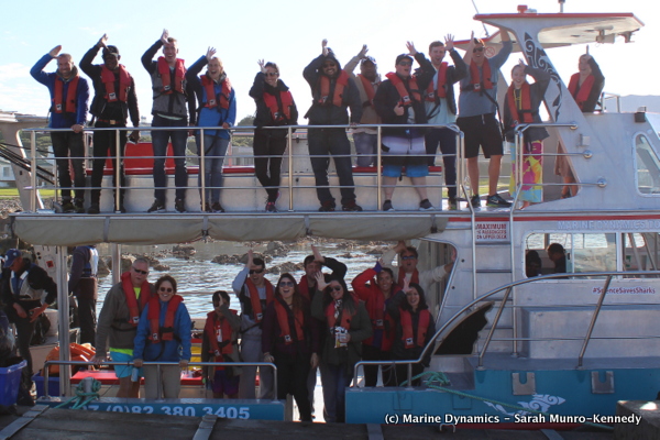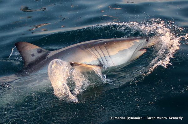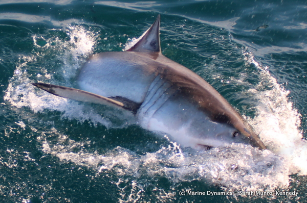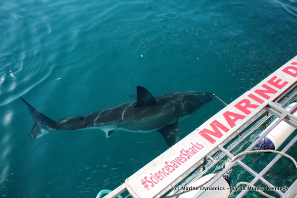 This is what dreams are made of! Today was an absolutely perfect day! We launched from Kleinbaai to a stunning sunrise and within 30 minutes we had our first white shark. It was the 2.6 meter male that we’ve been seeing around lately. Due to his continuous appearances at Slashfin, we decided that this young male needed a name. His dorsal fin has a bold gradient effect, much like the ombre hairstyle and he is male, so we decided on Hombre. He’s such a handsome shark! Hombre stuck around with us throughout the entire trip and was joined by the male version of Clampy, aka Clampo, the 3 meter male, and another male with 2 scratches behind his gill slits that we’ve also been seeing. With constant activity in front of the cage, this trip was a fantastic way to start our day! We even had 2 white sharks by the boat at one time! On our ride back into harbour, a visiting Southern Right Whale was spotted in the distance, relaxing just outside of the surf. These whales visit our shores between June and December to mate and give birth. They spend the other half of the year in Antarctica feeding on krill.