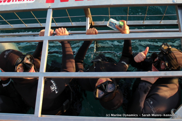 Our second trip launched with a gut feeling that it would be another superb trip. Our guts were right! Our divers didn’t even have their wetsuits half on when Hombre approached. Our first diver climbed into the cage as Hombre passed deep down, easy to see with the stunning visibility. Soon the cage was full and Clampo had also returned, investigating the seal decoy with immense curiosity. This trip also had some visits from the third male from the first trip, although he didn’t seem to spend too much time as Clampo seemed to dominate this trip. He was joined by one other shark, about 3 meters long with several dark scars running down its side. This shark behaved much like the third male and didn’t spend very long around the boat. After everyone had several beautiful views of these amazing animals we headed back into shore, excited for the final trip of the day.