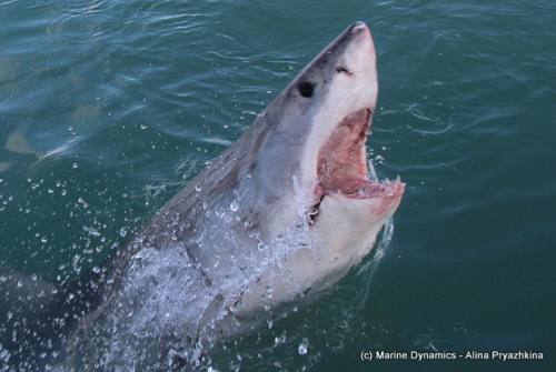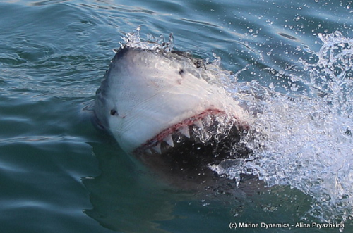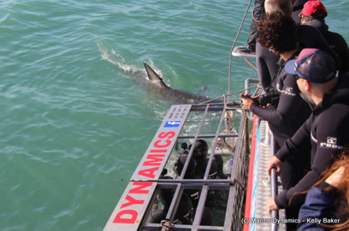 A lovely Wednesday out on the sea with a little bit of swell and wind lingering for the entire day but overall a pleasant day to spend on the water. The first trip headed into the Shallows and in time a shark was seen with a Bronze whaler making its' presence known to those on board Slashfin. The Bronze whalers ruled for close to 30 minutes until the larger predatory shark came on in. The first Great White of the day was the feisty little juvenile female that has kept us on our toes for nearly six weeks now as she comes speeding in out of nowhere and has a knack for launching herself up and out of the water with little warning. Another White shark also visited Slashfin this morning, with the large, clean female from yesterdays trip appearing, a new individual to the bay for the season, we are happy to be seeing new Great Whites moving into the bay. This female is a large animal, estimated at 4.0m in length, however, exhibits behaviour similar to our small female, with some fast-paced action seen around the boat when she is there.