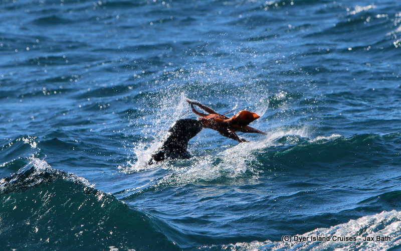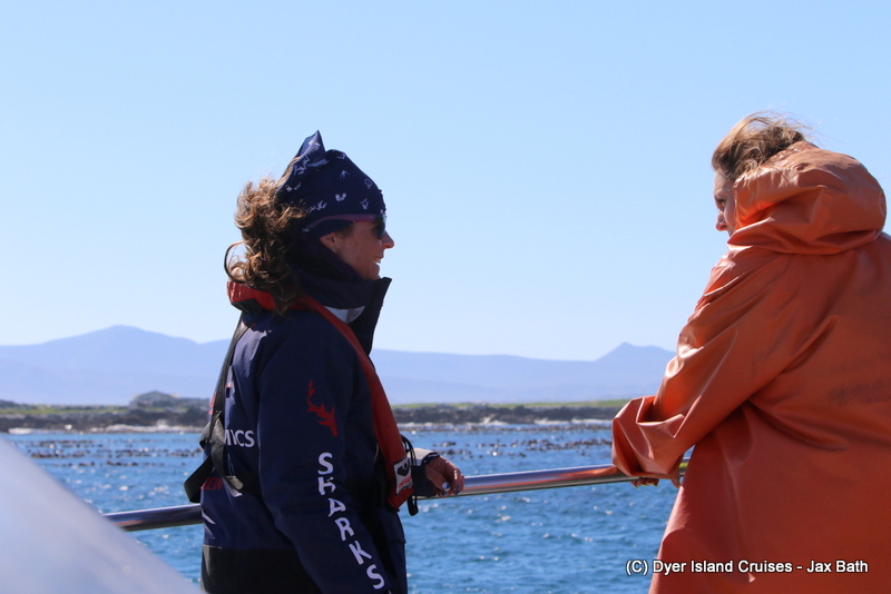 Today we enjoyed another day on the water, encountering different types of marine life throughout the day. For the first trip we went straight out to deeper waters where we encountered several humpback whales. This species of whale has been coming past fairly regularly in their north-bound migration the last days, and we have been enjoying every single encounter with them. During the second trip we also encountered humpback whales, travelling very close to the coastline. First we counted three, but in the end we were with 4 individuals. We were very lucky to see a couple of tail throws from these whales, and also one of them gave a very powerful and loud blow next to our boat. On both trips today we paid a visit to the Cape fur seal colony on Geyser rock. On the first trip we also encountered a great white shark together with the shark cage diving company Marine Dynamics, and on the third trip we went to see the African penguins in Sponge bay on Dyer Island. Every tour with us is very different, which adds to the excitement because we never know which members of the Marine Big 5 we will encounter.