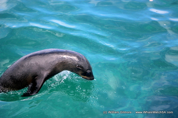 Our Shark Cage Diving boat had already returned to the harbour, so fortunately, we met another company that had a cage in that water. Within seconds a feisty Bronze Whaler appeared at the bait. Luckily, everyone was able to see the shark, and as to not interfere with their diving operation we moved on again to our seal colony. Once more we were greeted by some playful juvenile seals, performing aerial stunts around the boat much to the amusement of everyone on board.