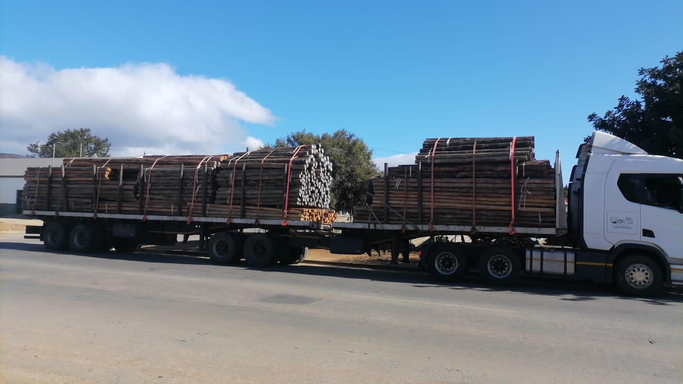 Truck loaded with quality raw debarked pinaster pine poles ready to be treated and distributed to the farmlands.