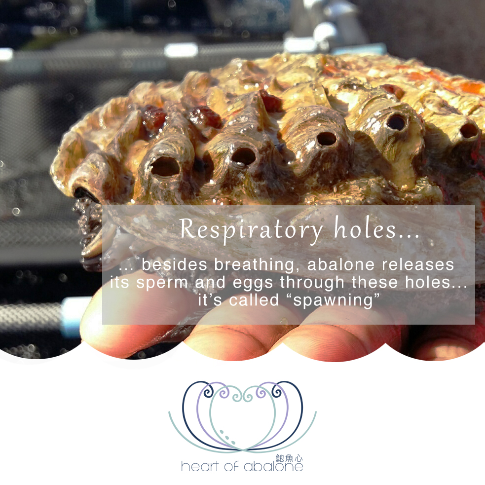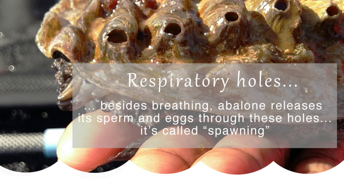 Have you ever wondered what the holes on the abalone’s shell are for? Well, besides breathing (the holes are called “respiratory holes”) the abalone releases their sperm and eggs through these holes. Abalone is called “broadcast spawners” - this means that the males and females can release 10-15 million sperm and eggs in one spawning! Fertilisation then takes place in the ocean.