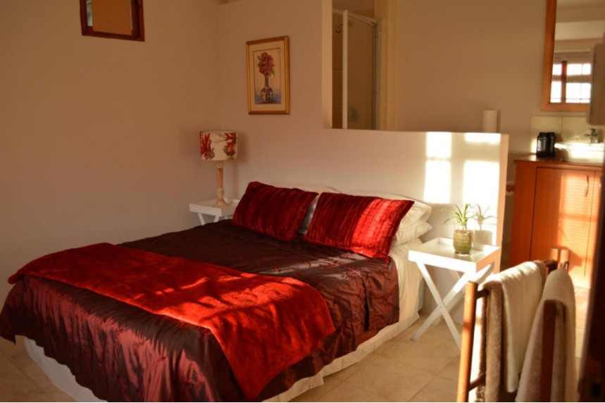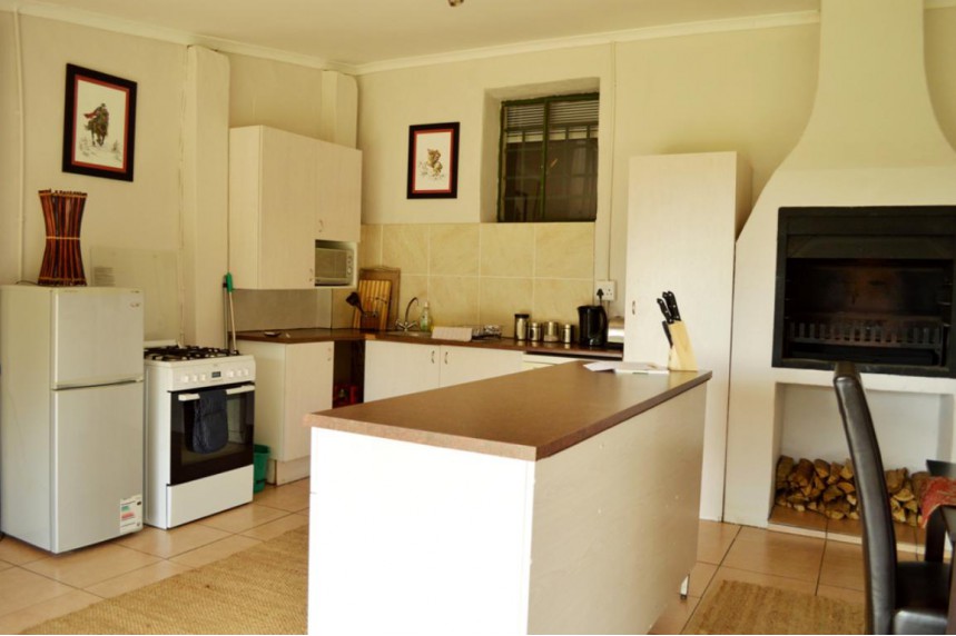 The kitchen is equipped with everything guests will need for self-catering including a built-in braai, kettle, gas stove with electric oven, microwave, dishwasher, fridge and enough cutlery for 6 people. The kitchen and dining area is part of an open plan with an extra flat screen TV. The lounge holds comfortable seating with a fireplace, full HD DStv & a DVD player.