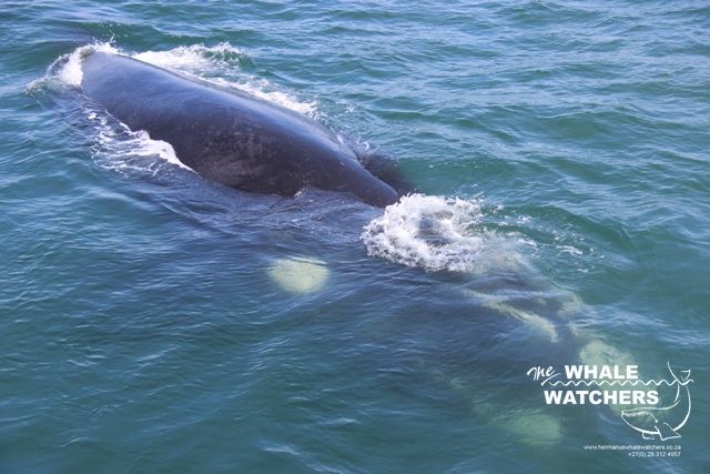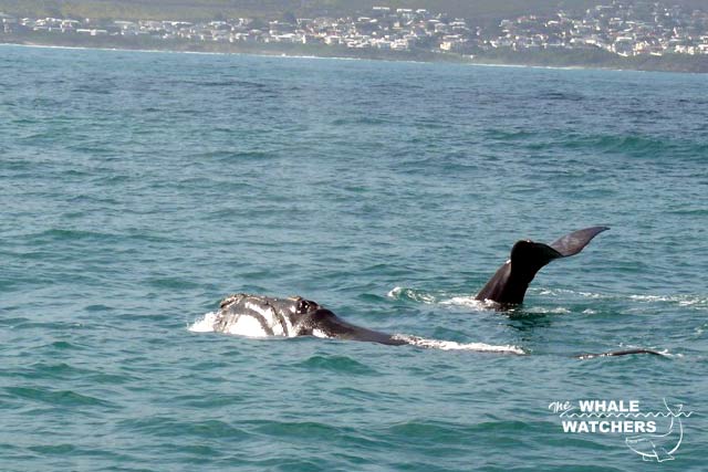 Southern Right Whales are easily distinguished from the other 2 baleen whales (Humpback & Bryde’s whales) by three distinct characteristics: V-shaped blow, callosities on their heads and the lack of a dorsal fin on their broad backs.