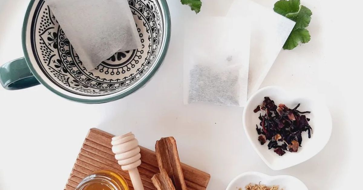 A glorious box of 10 assorted natural herbals teas bags, a mini honey pot, and a honey spoon.