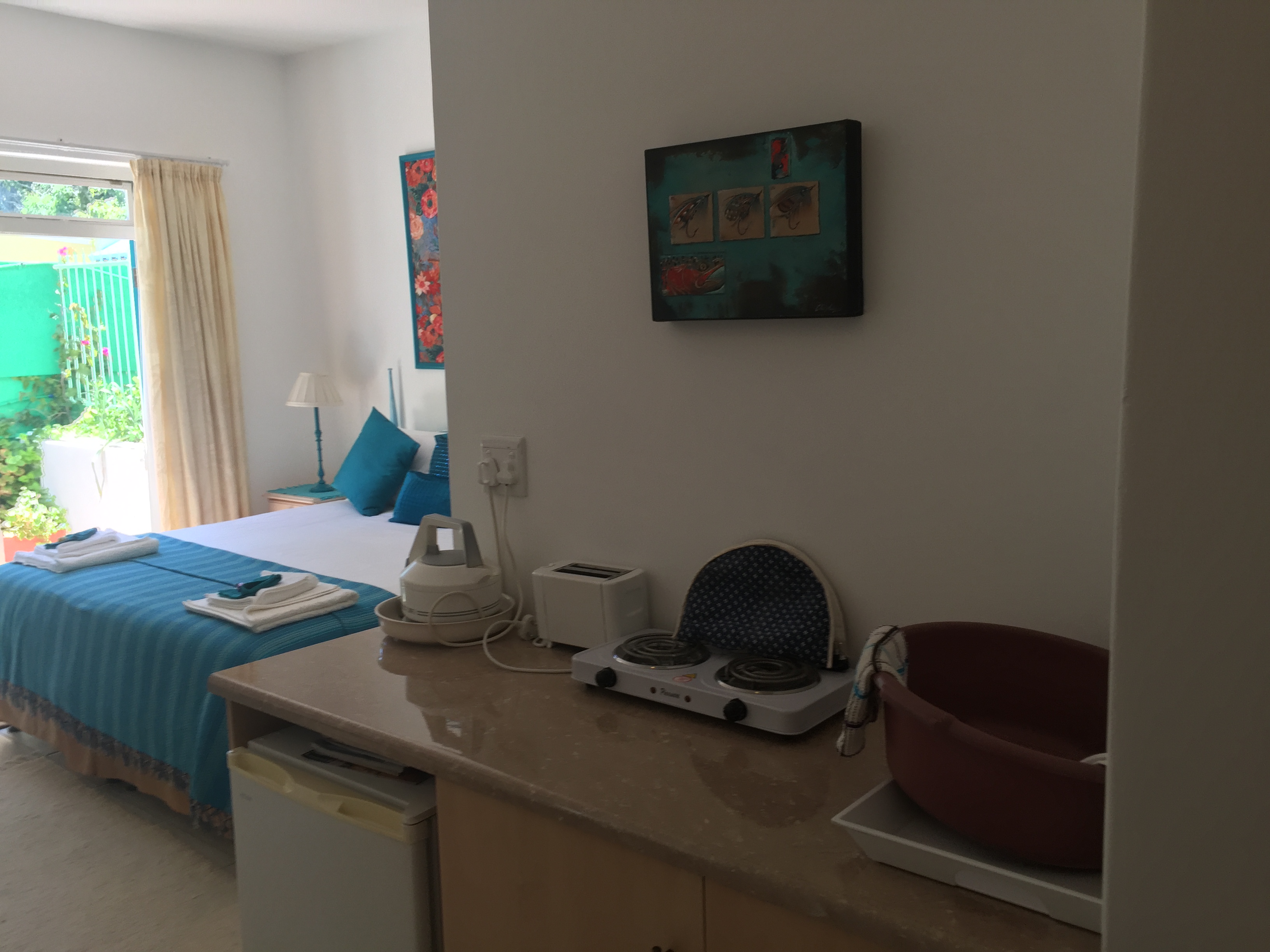 Flamingo Suite is on the upper level and has direct access to the garden terrace with amazing mountain and sea views. The suite has a well-equipped kitchenette for light self-catering.