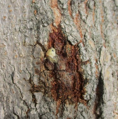 • Entry and exit holes - very small holes on the bark of the tree, the size of a sesame seed (2mm); shotgun-like scars developing around the holes