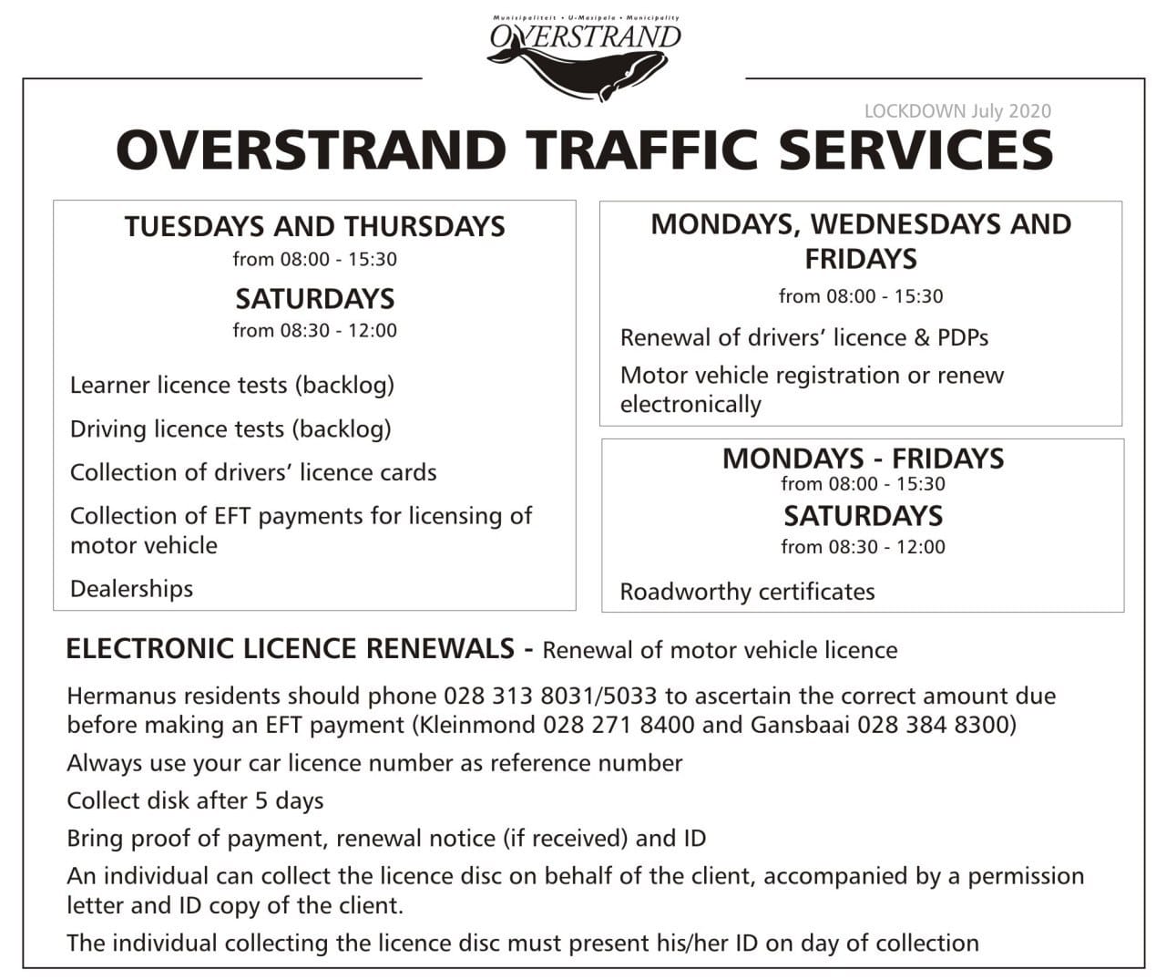 • As far as possible, residents who are able to RENEW VEHICLE LICENSES ONLINE should do so. Hermanus residents can contact 028 313 8031/5033 to ascertain the correct amount due before making an EFT payment. Always use your car licence number as reference number.