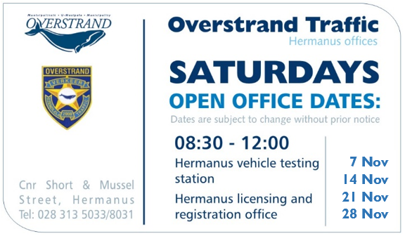 For your convenience, the Hermanus Traffic Department will be open every Saturday morning, from 08:30 until 12:00, during the month of November 2020: