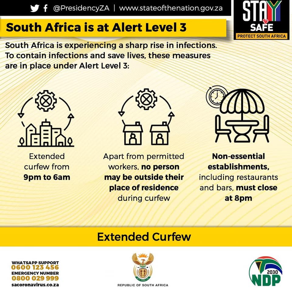 - The nationwide curfew will be extended from 9pm to 6am. Apart from permitted workers and for medical and security emergencies, nobody is allowed outside their place of residence during curfew.