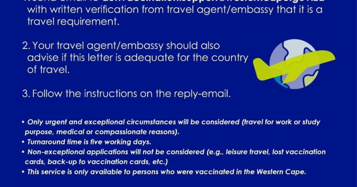 1. Send email to dohvaccination.support@westerncape.gov.za with written verification from travel agent/embassy that it is a travel requirement.
