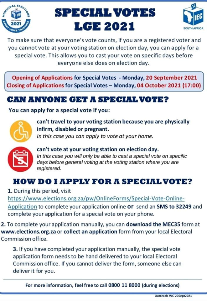 Special vote allows a registered voter who can't vote at their voting station on election day to apply to vote on a predetermined day before election day.