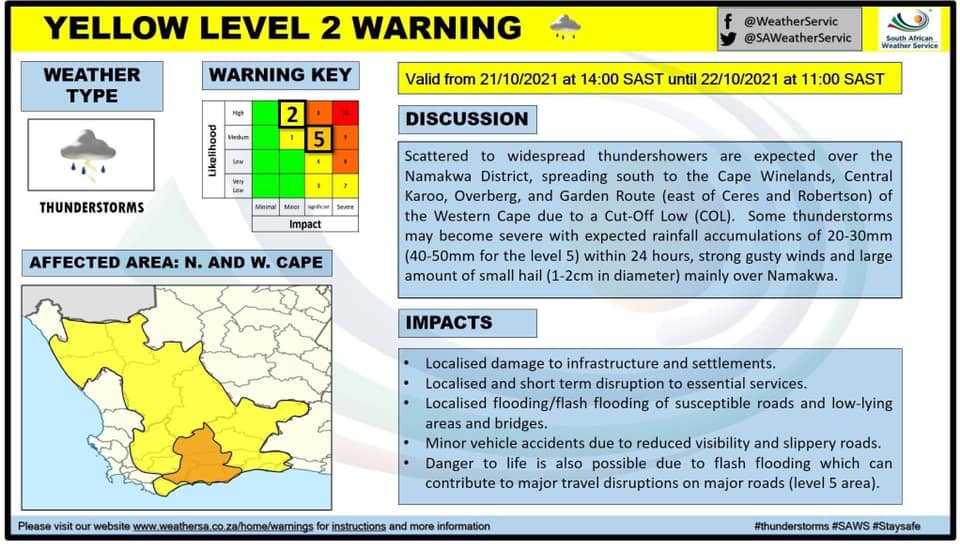 Please take note of the following weather warnings pertaining to Thursday, 21 October until Friday, 22 October.