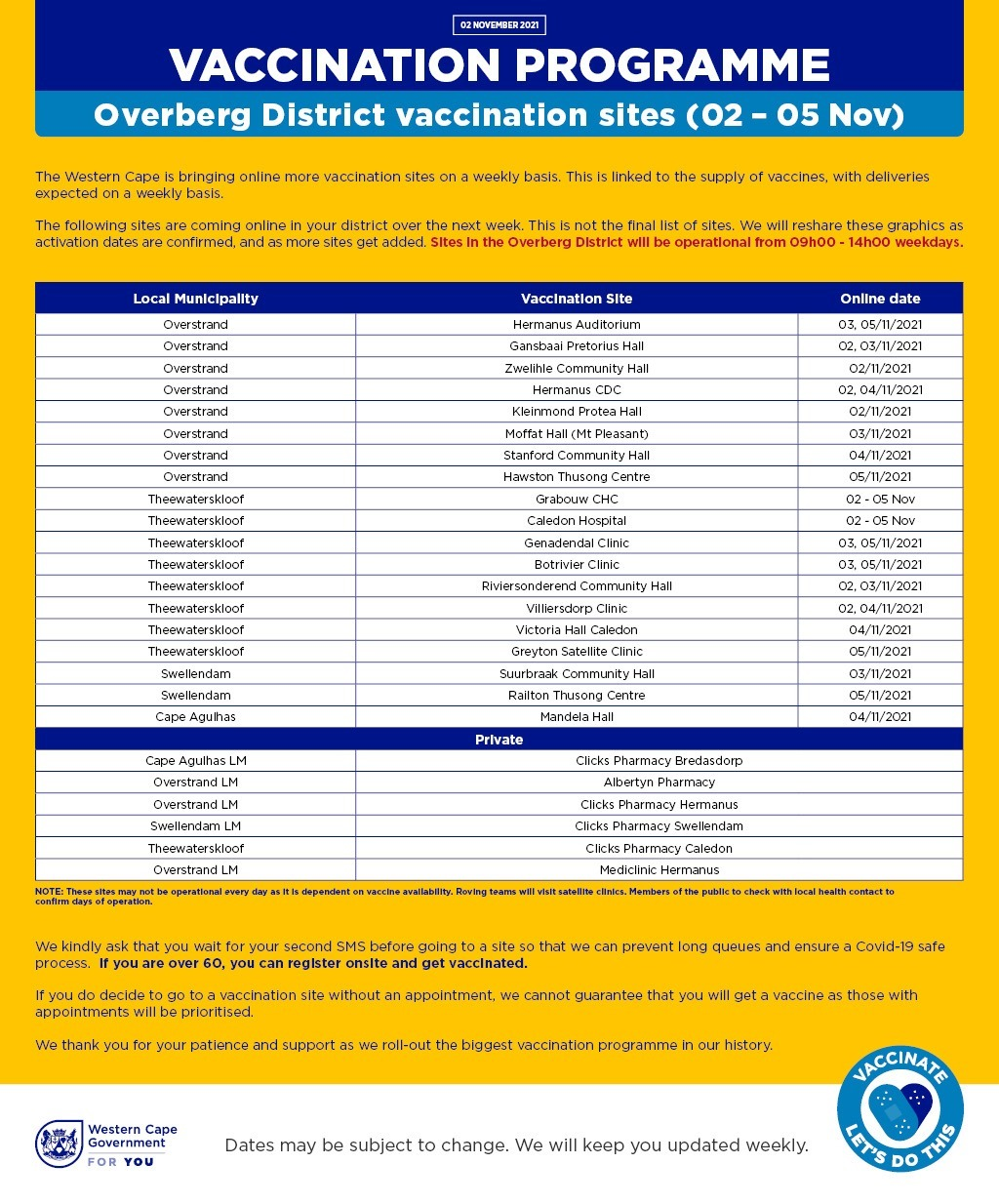 Sites in Overstrand will be operational from 09:00 - 14:00 on weekdays. The vaccination site at Hermanus