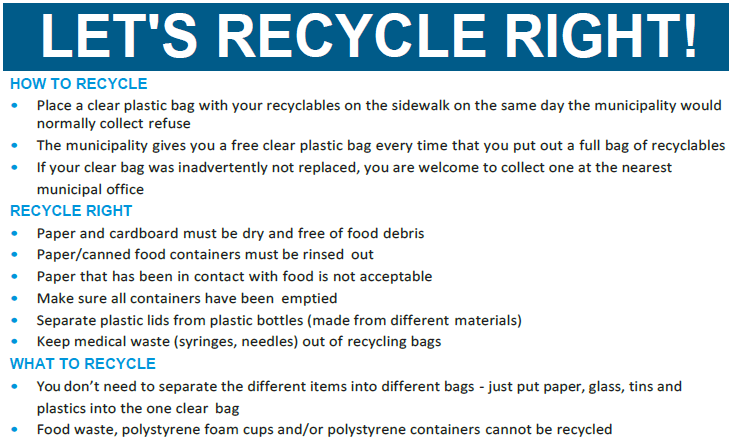 • You don’t need to separate the different items into different bags - just put paper, glass, tins and plastics into the one clear bag