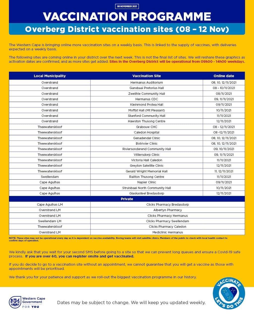 Sites in Overstrand will be operational from 09:00 - 14:00 on weekdays.