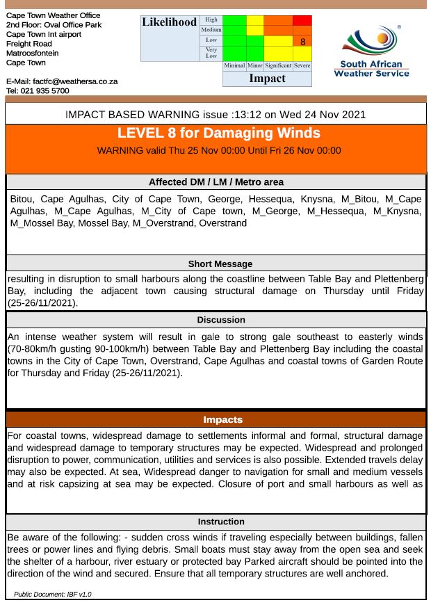 An intense weather system will result in gale to strong gale southeast to easterly winds (70-80km/h gusting 90-100km/h) between Table Bay and Plettenberg Bay including the coastal towns in the City of Cape Town, Overstrand, Cape Agulhas and coastal towns of Garden Route for Thursday and Friday.