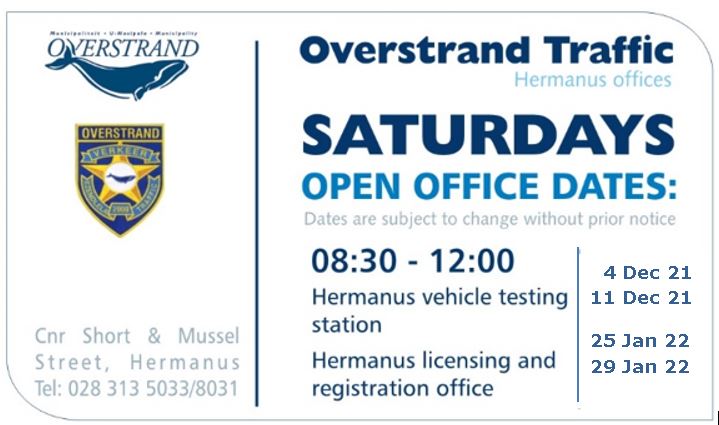 The Hermanus Traffic Department will be open on Saturday morning, 4 & 11 December 2021 and 15 & 29 January 2022 from 08:30 until 12:00.