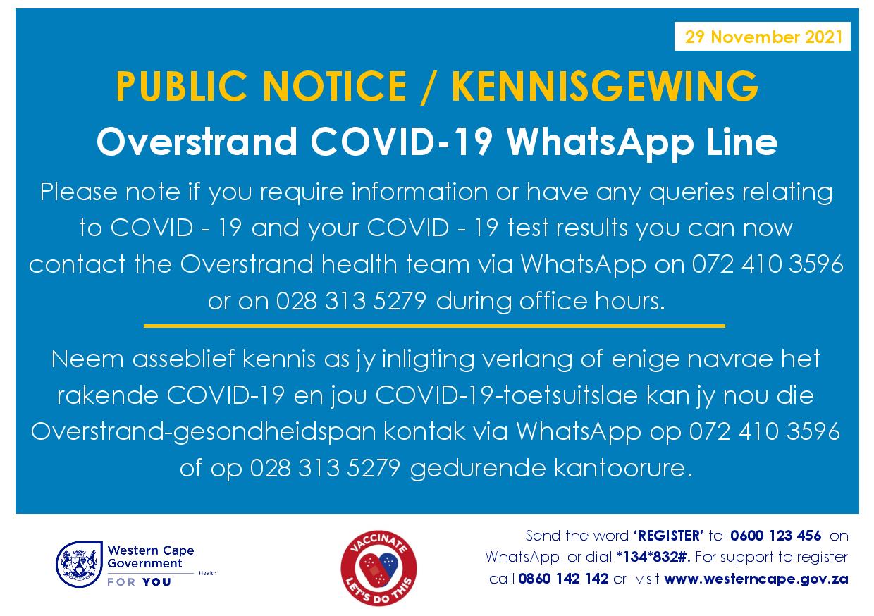 Please note if you require information or have any queries relating to COVID - 19 and your COVID - 19 test results you can now contact the Overstrand health team via WhatsApp on 072 410 3596 or on 028 313 5279 during office hours.