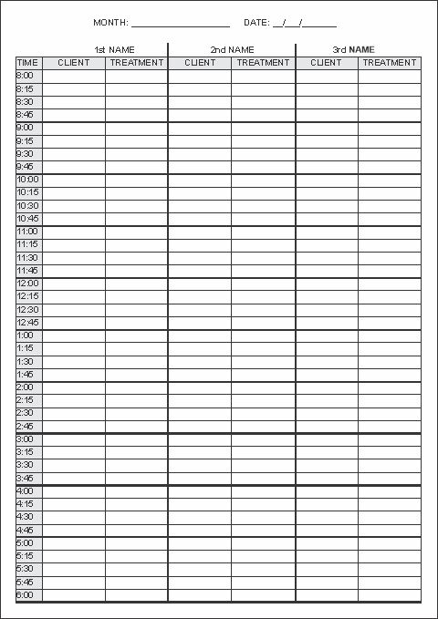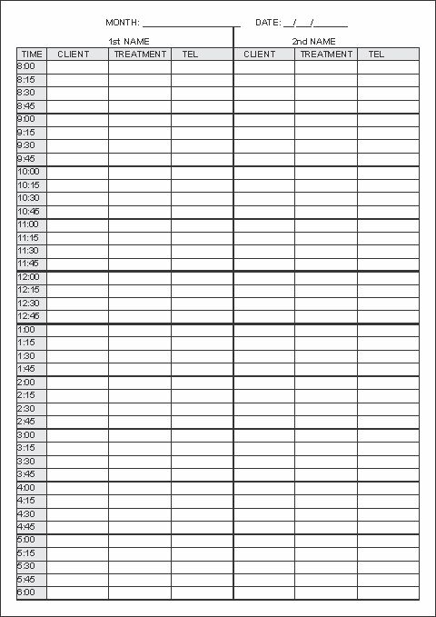 Another example of an Appointment Book is one designed for a salon with 2 operators. Each page has 3 panels of 2 columns each. So, Name 1 would use the first column, Name 2, the second, Name 1 the third, then Name 2 would use the first column on the reverse of the page. Or, Name 1 could use all 3 columns on the page and Name 2 the 3 on the reverse.