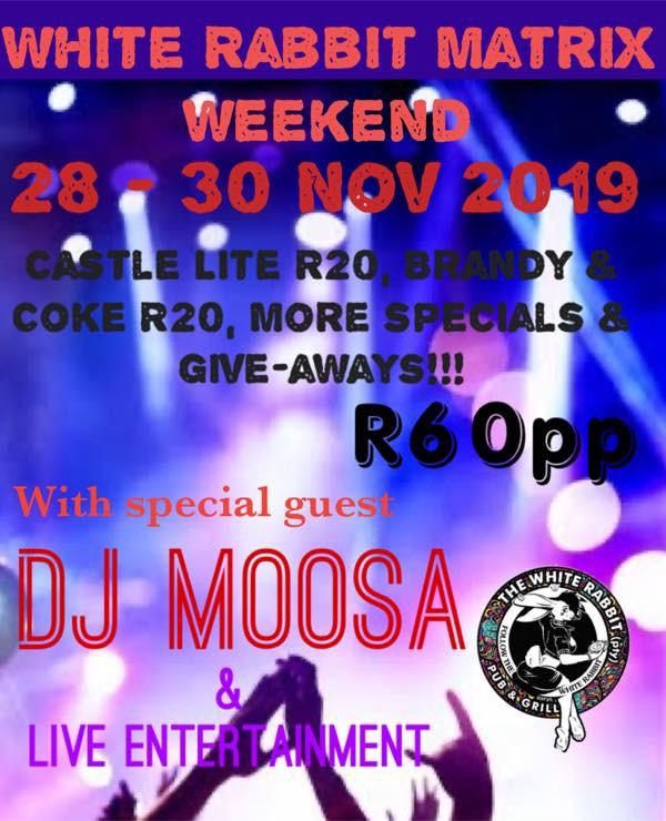 Join The White Rabbit Pub and special guest, DJ MOOSA for a weekend of live entertainment and drink specials!