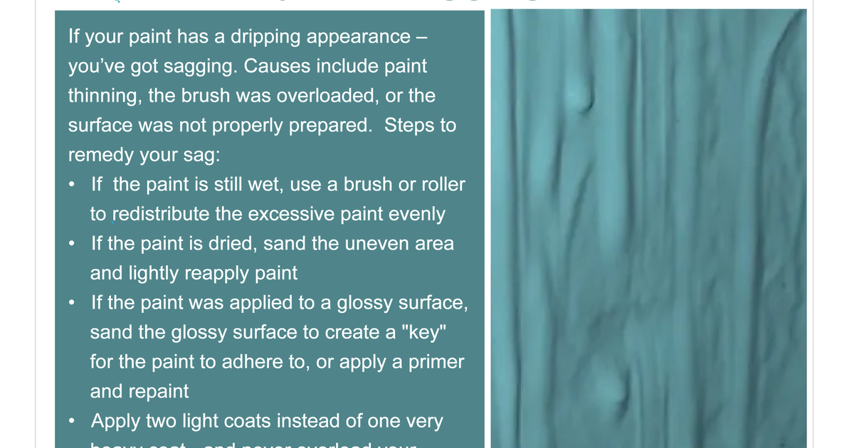 If your paint has a dripping appearance - you've got sagging. Causes include paint thinning, the brush being overloaded, or the surface was not properly prepared.