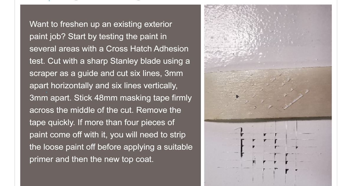 Want to freshen up an existing exterior paint job? Start by testing the paint in several areas with a cross-hatch adhesion test. Cut with a sharp Stanley blade using a scraper as a guide and cut six lines, 3mm apart horizontally and six lines vertically, 3mm apart. Stick 45mm masking tape firmly across the middle of the cut. Remove the tape quickly. If more than four pieces of paint come off with it you will need to strip the loose paint off before applying a suitable primer and then the next top coat.